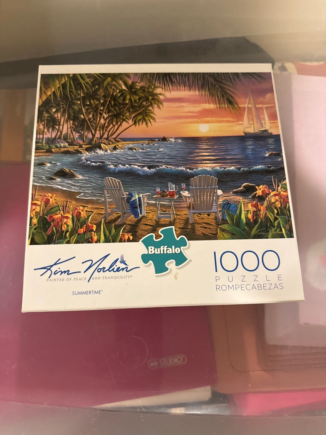 1000 piece jigsaw puzzle featuring a beach scene. The puzzle is in its original box.