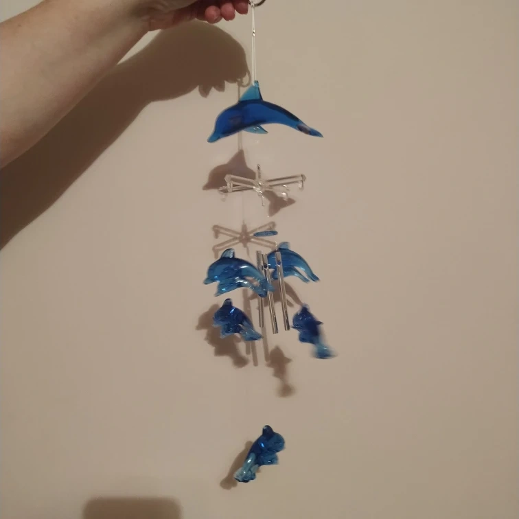 Blue glass dolphin wind chime with metal chimes. There are five dolphins on the chime.