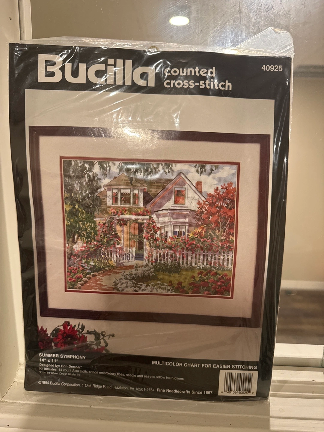 Counted cross stitch kit, design features a house and flowers, comes with embroidery floss, needle and easy-to-follow instructions.