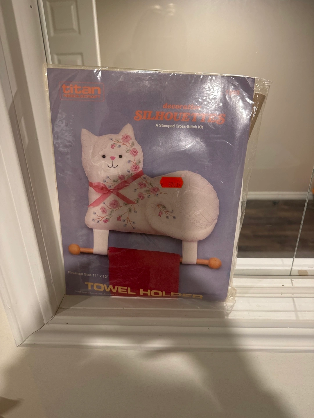 Stamped cross stitch kit, includes pre-stamped cotton fabric, embroidery floss, needle, trims, and complete instructions. Stuffed and towel not included.