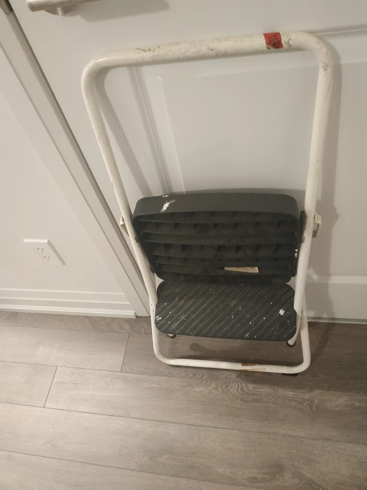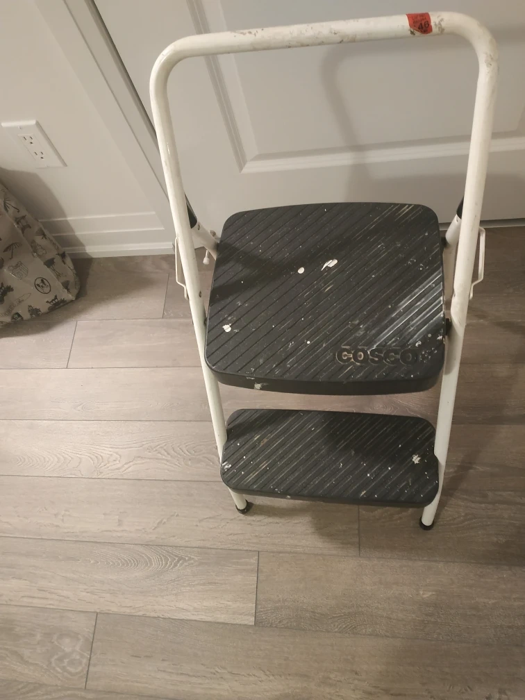 White folding step stool with two steps. Has a handrail. Used but in good condition. Works perfectly although there are paint marks on the stool.