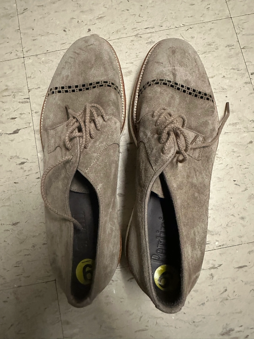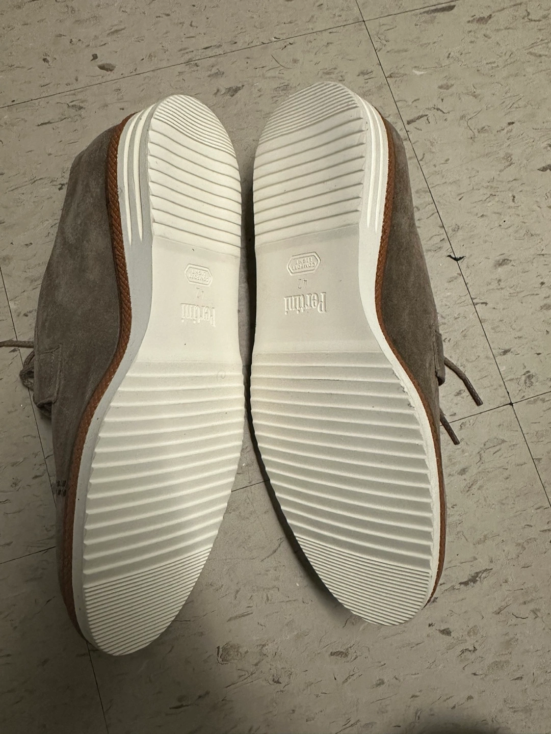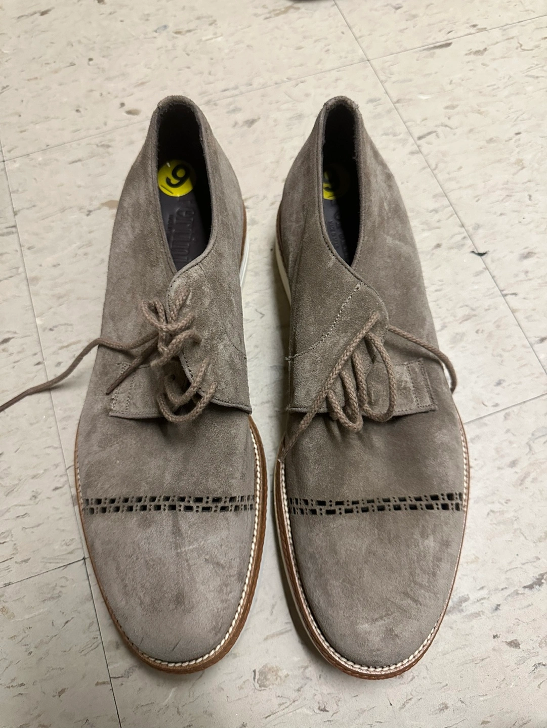 Suede shoes with white soles. Lace-up style. Grey colour. Size 9, brand new.