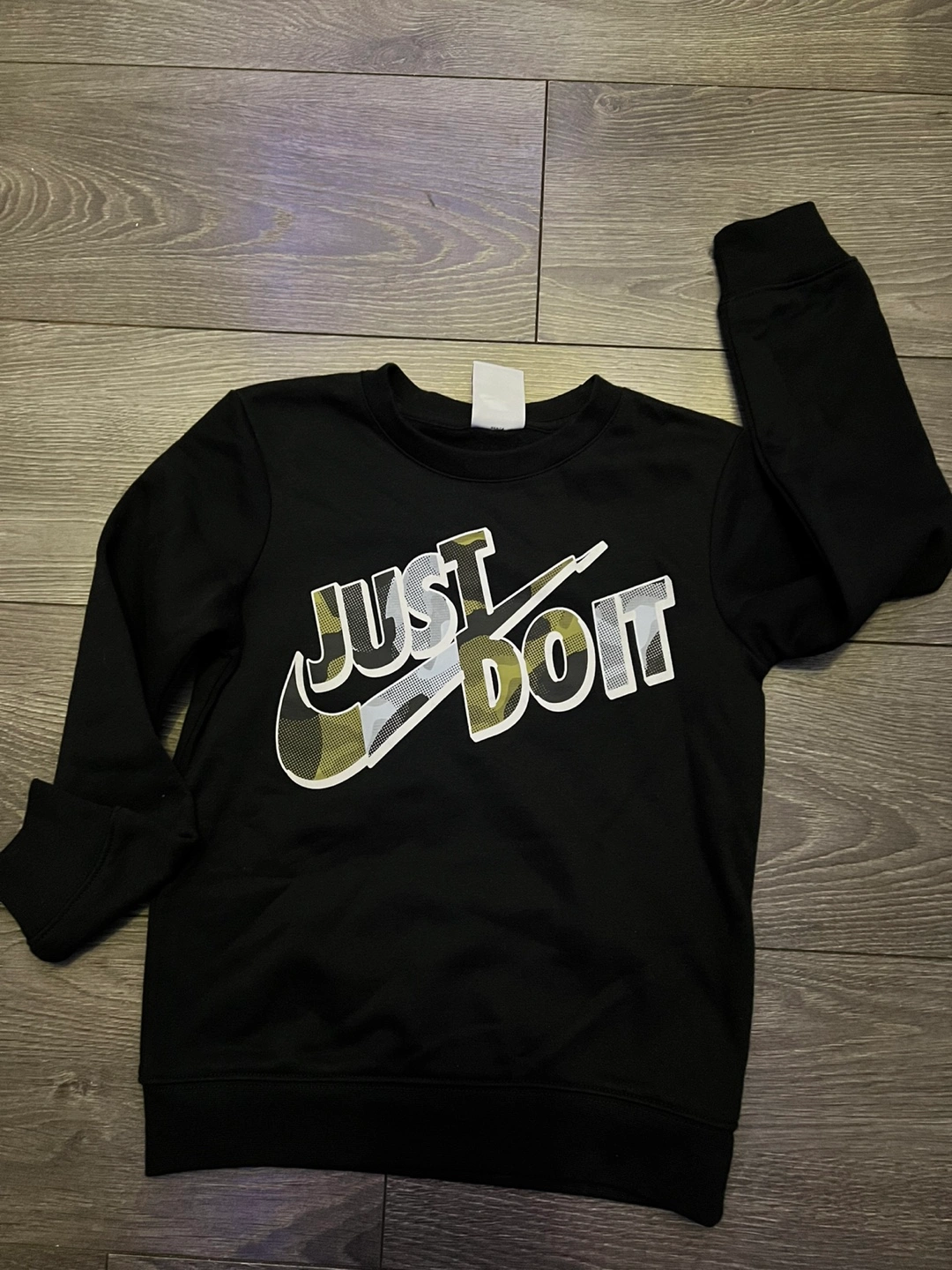 Black sweatshirt with camo Just Do It graphic. Size 6-7 years. Made in Vietnam.