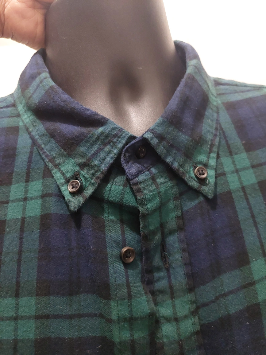 Long sleeve button-up 100% cotton shirt with a green and blue plaid pattern. It has a single pocket on the left side. Made of 100% cotton. Chest measurement: 24 Length:26 We're downsizing our family closet. Great pieces in excellent condition. Please bowse through my other listings. Discount applies to bundling.