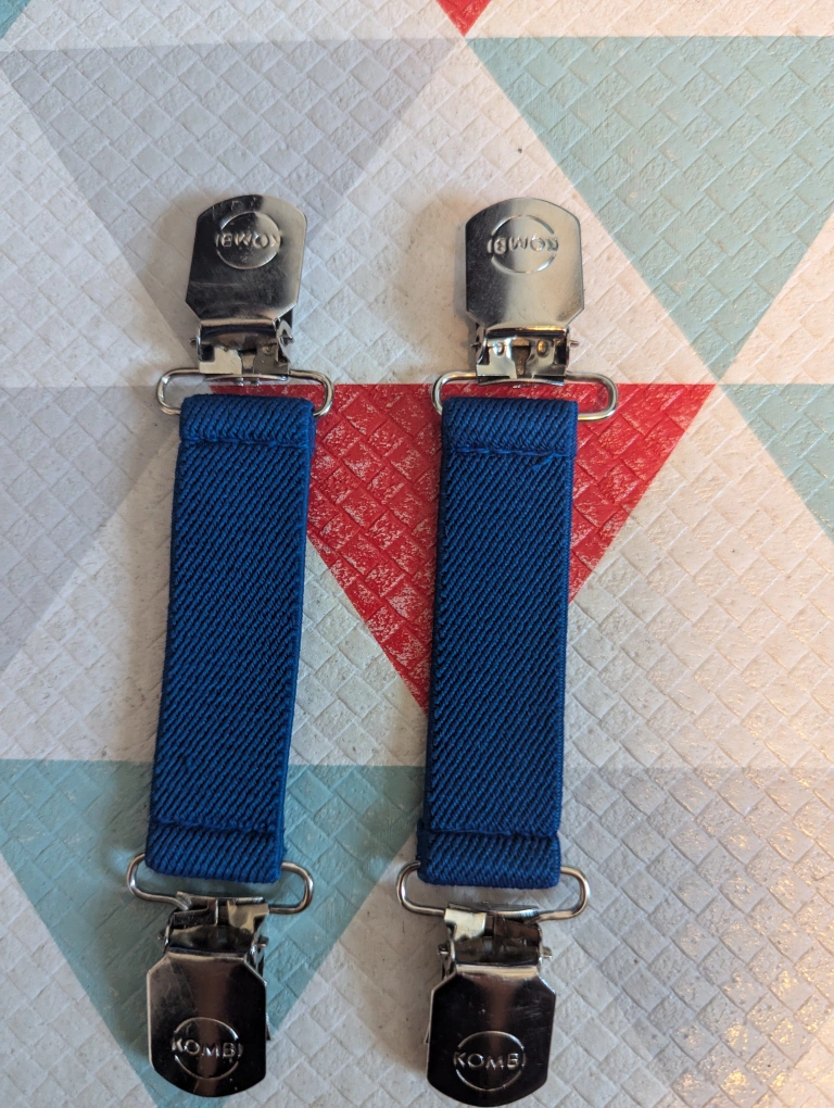 Kombi blue suspenders, metal clips. Good used condition, just a minor scratch on one of the clips (see 2nd photo), but works perfectly. ๐ญ Smoke / Pet Free Home ๐ก