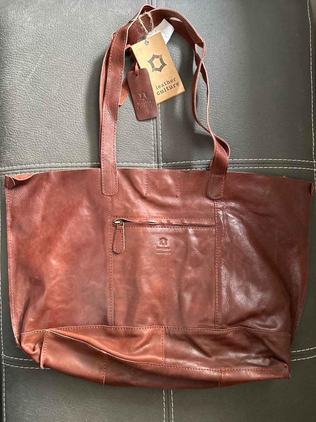 Large brown leather tote bag with a zippered pocket on the front. The bag has two top handles.