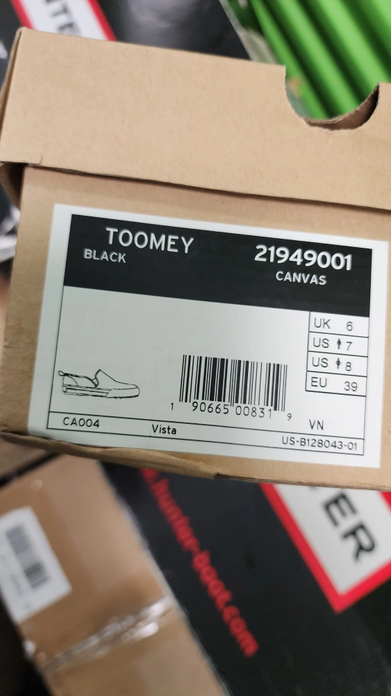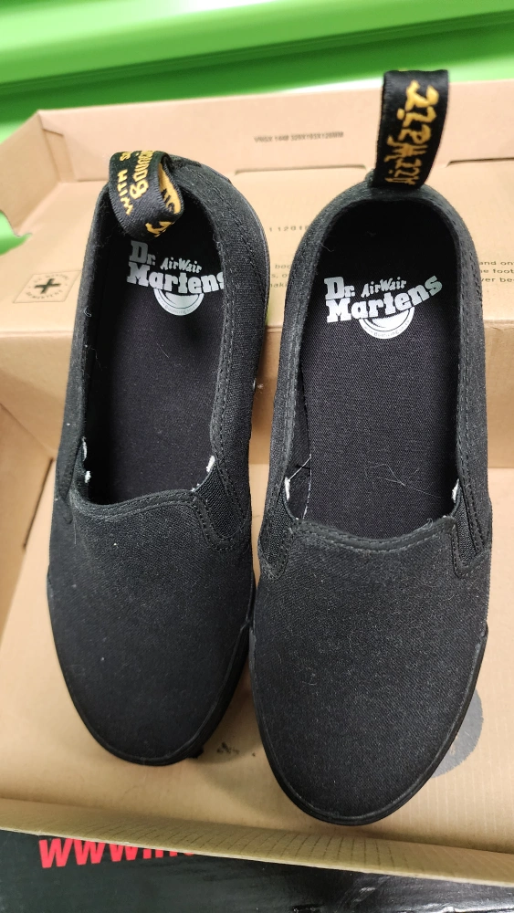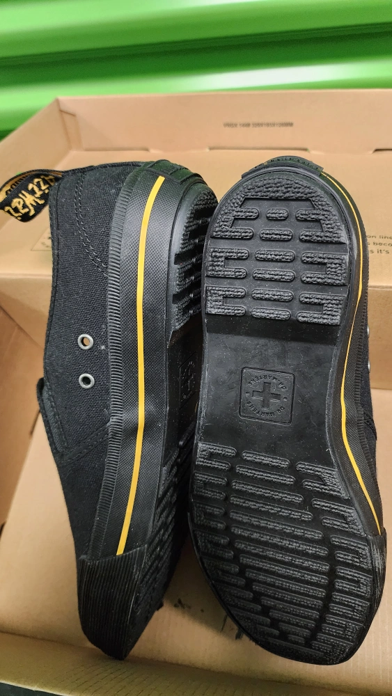 Black canvas slip-on shoes with yellow stitching. Size 8 US.