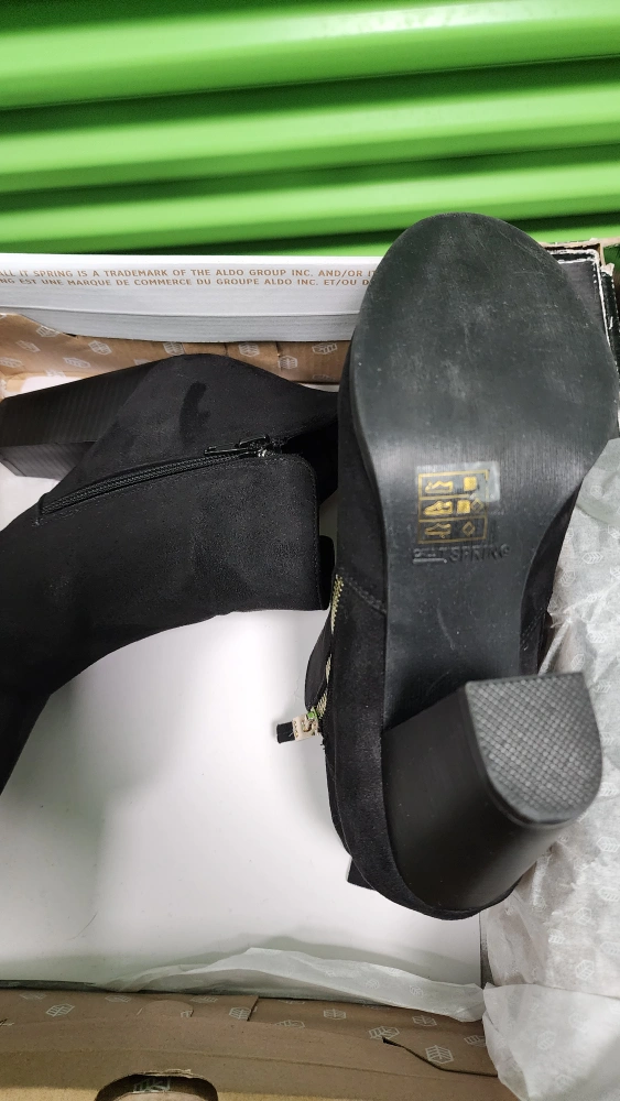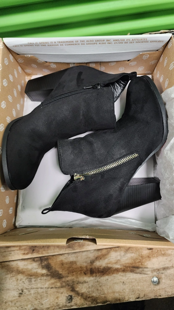 Black suede ankle boots with gold zipper accents and a block heel. They are in good condition and come with the original box.