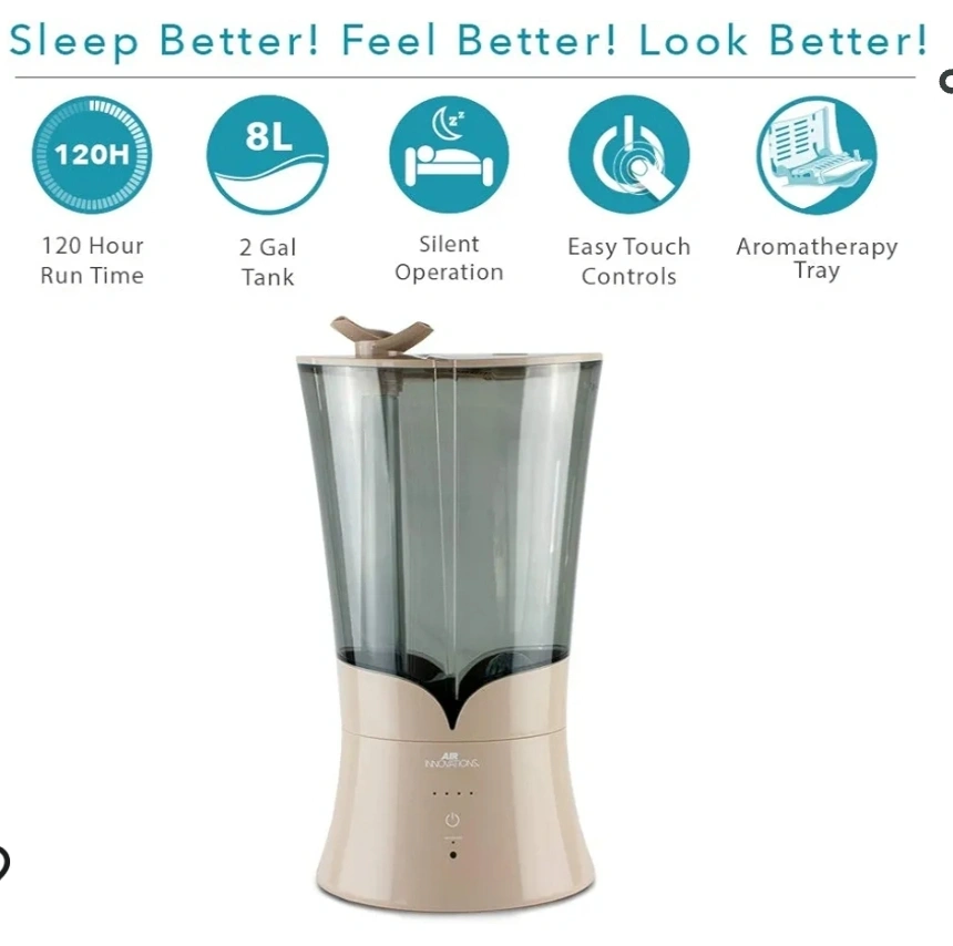 BNIB Brand New In Box Top Fill Ultrasonic Humidifier 2 Available (1 Taupe and 1 Black Unit) Fully Programmable Runs Up To 120 Hours On One Tank - Fill it once every 5 days 4 mist settings (low, medium, high and turbo) Permanent ceramic filter Easily converts from table top unit to floor unit 16” Removable Extension Nozzle Completely silent when running Auto safety feature ensures that the unit will turn off when it runs out of water Ideal humidity in your home should be between 30 percent and 50 percent LED Dimmer Includes remote control 2 gallon capacity Dimensions: Table Top Setup 10.5"L x 12"W x 20"H Floor Unit Setup 10.5"L x 12"W x 36"H The water tank, base tank and base are made with an antimicrobial inhibitor to help prevent bacteria and mould from growing inside the tank. By increasing the humidity in your home, ultrasonic humidifiers can help alleviate dry skin, help eliminate dry air that can irritate your nose and throat, may relieve some of the discomforts of colds and flu, and can help prevent drying and cracking of wood furniture and flooring. Built-In Aromatherapy Tray to fill your home with calming, relaxing fragrance ***Please Check Out My Other Ads