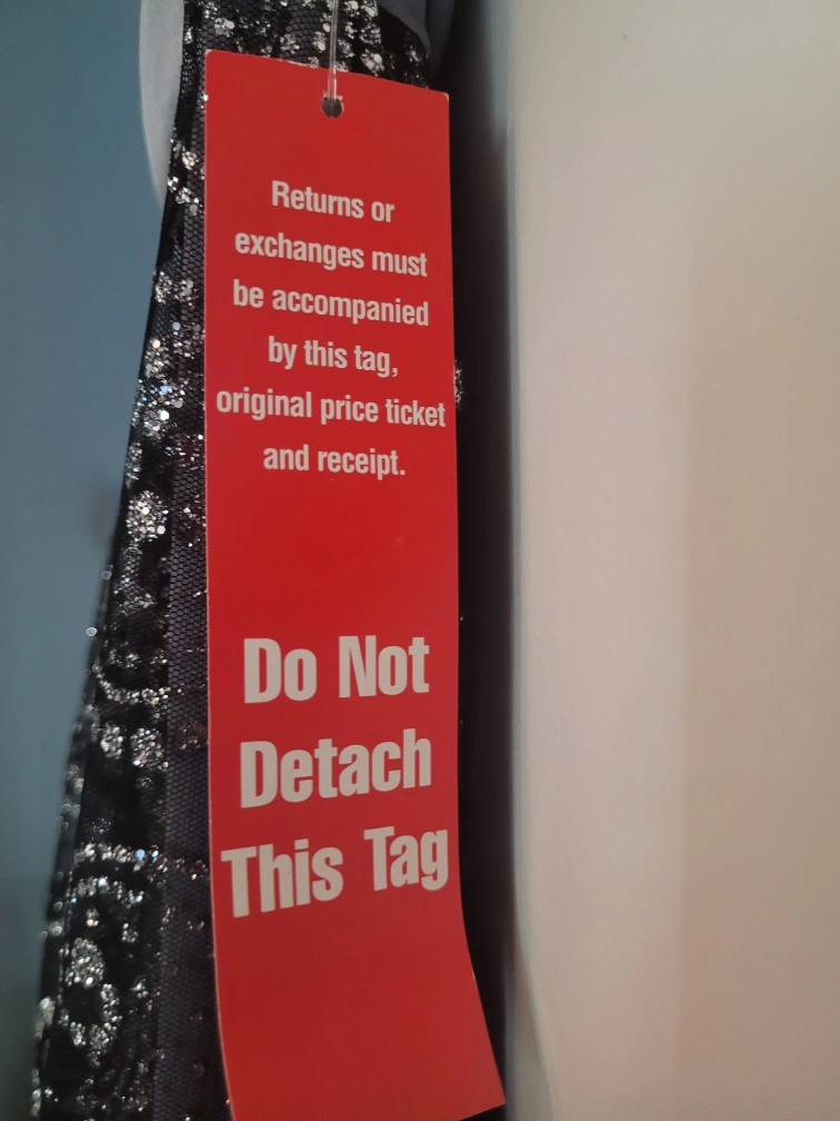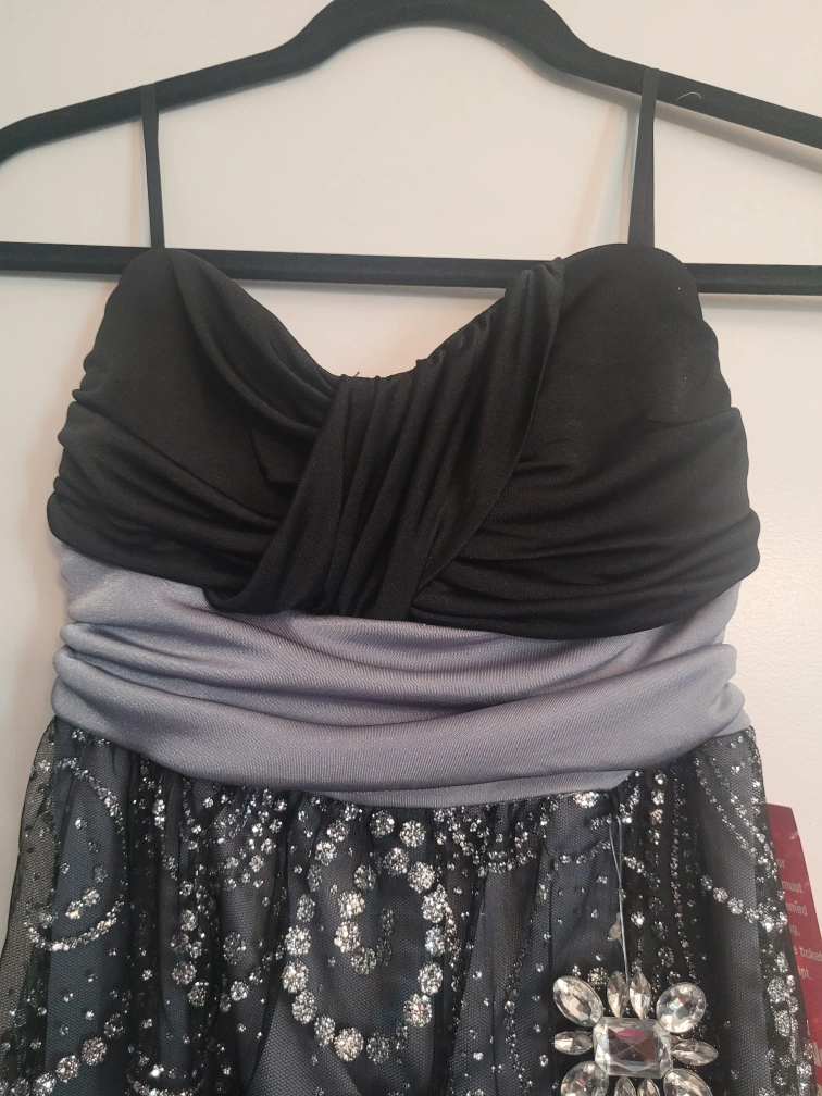 Strapless dress, black top with grey band, black mesh skirt with silver glitter and embellishment. Size 3. perfect for the tiny petite young ladies.