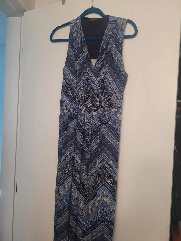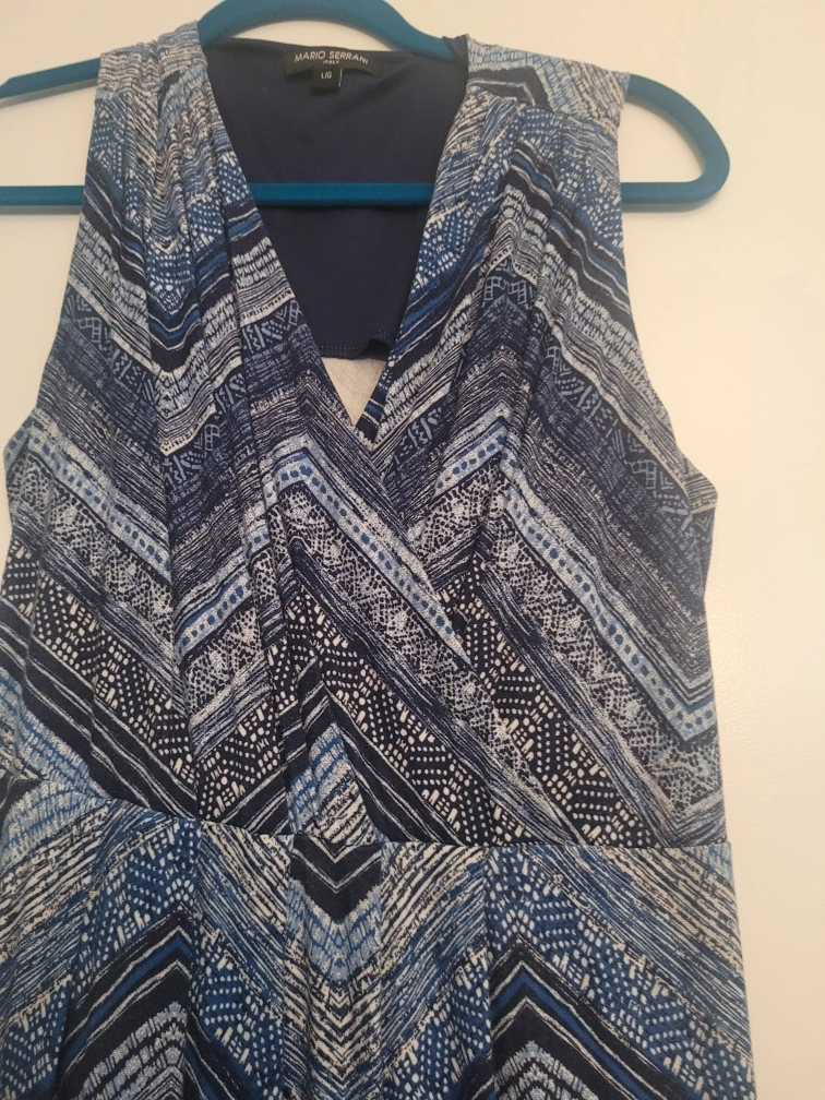 Sleeveless maxi dress with a V-neck. Blue, white, and black geometric pattern. Flowy and comfortable. Large size