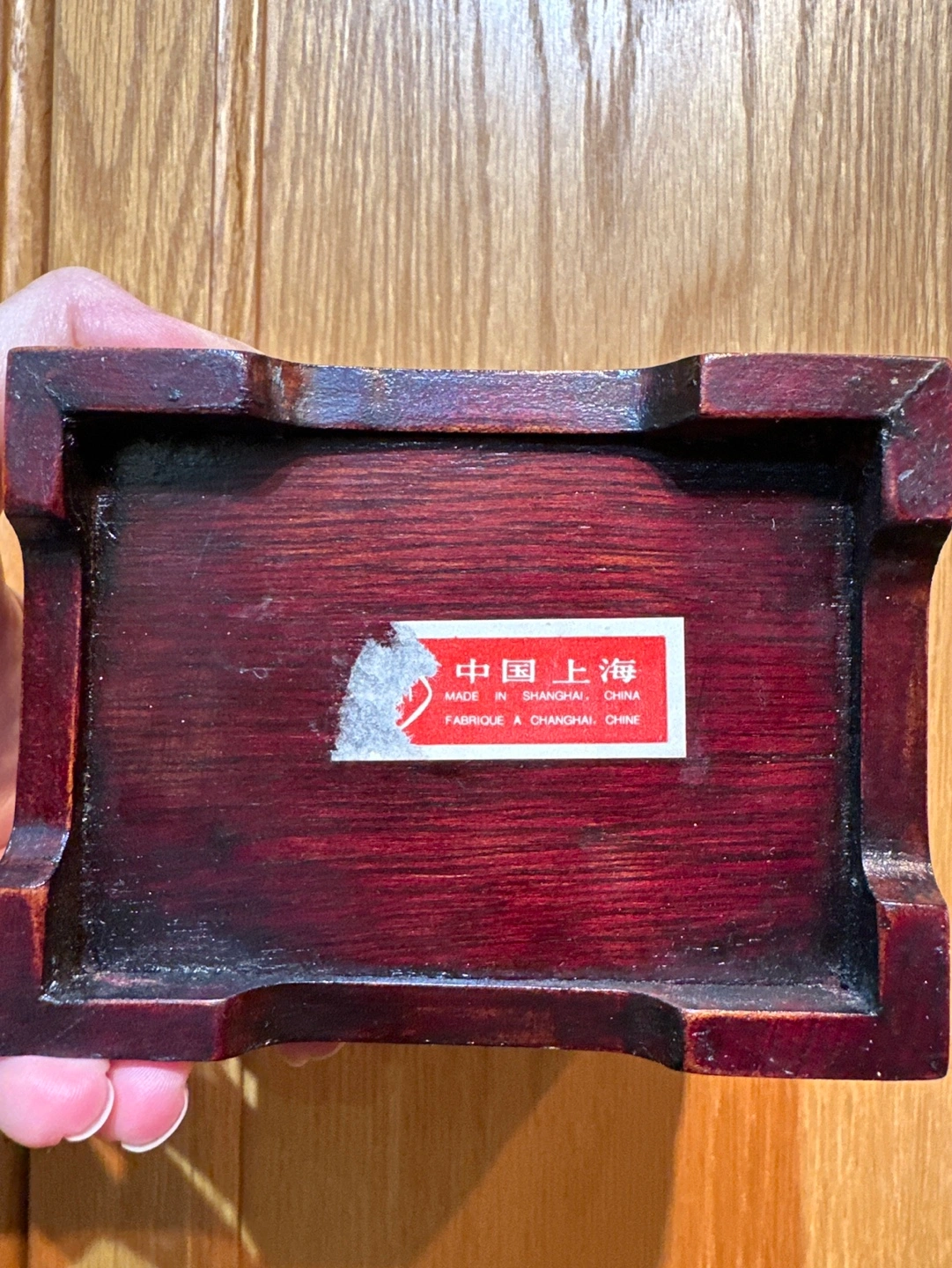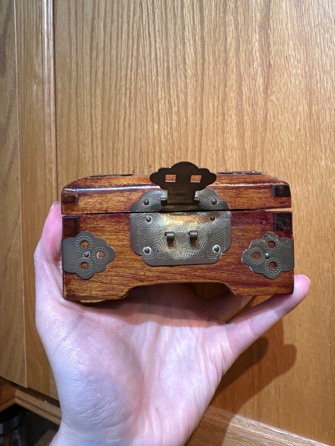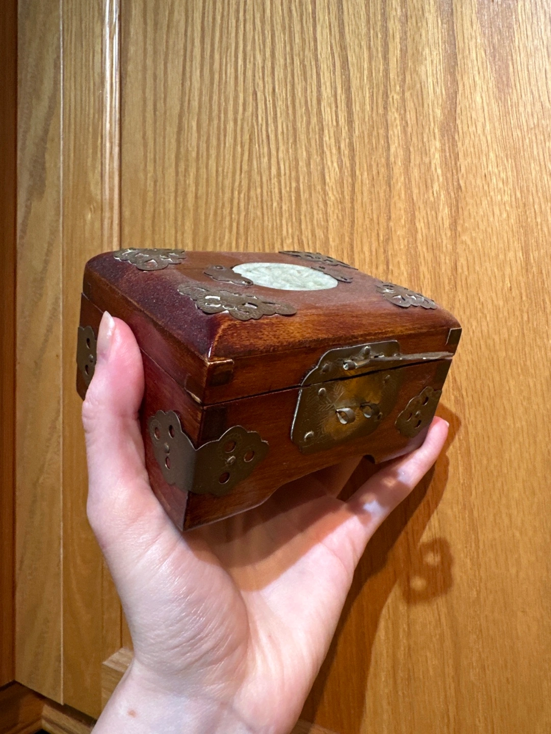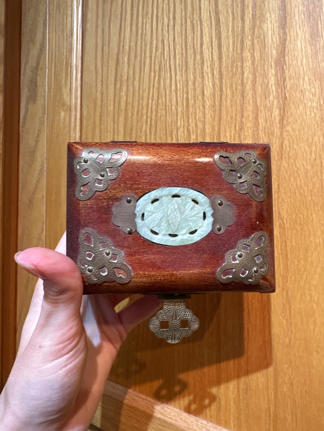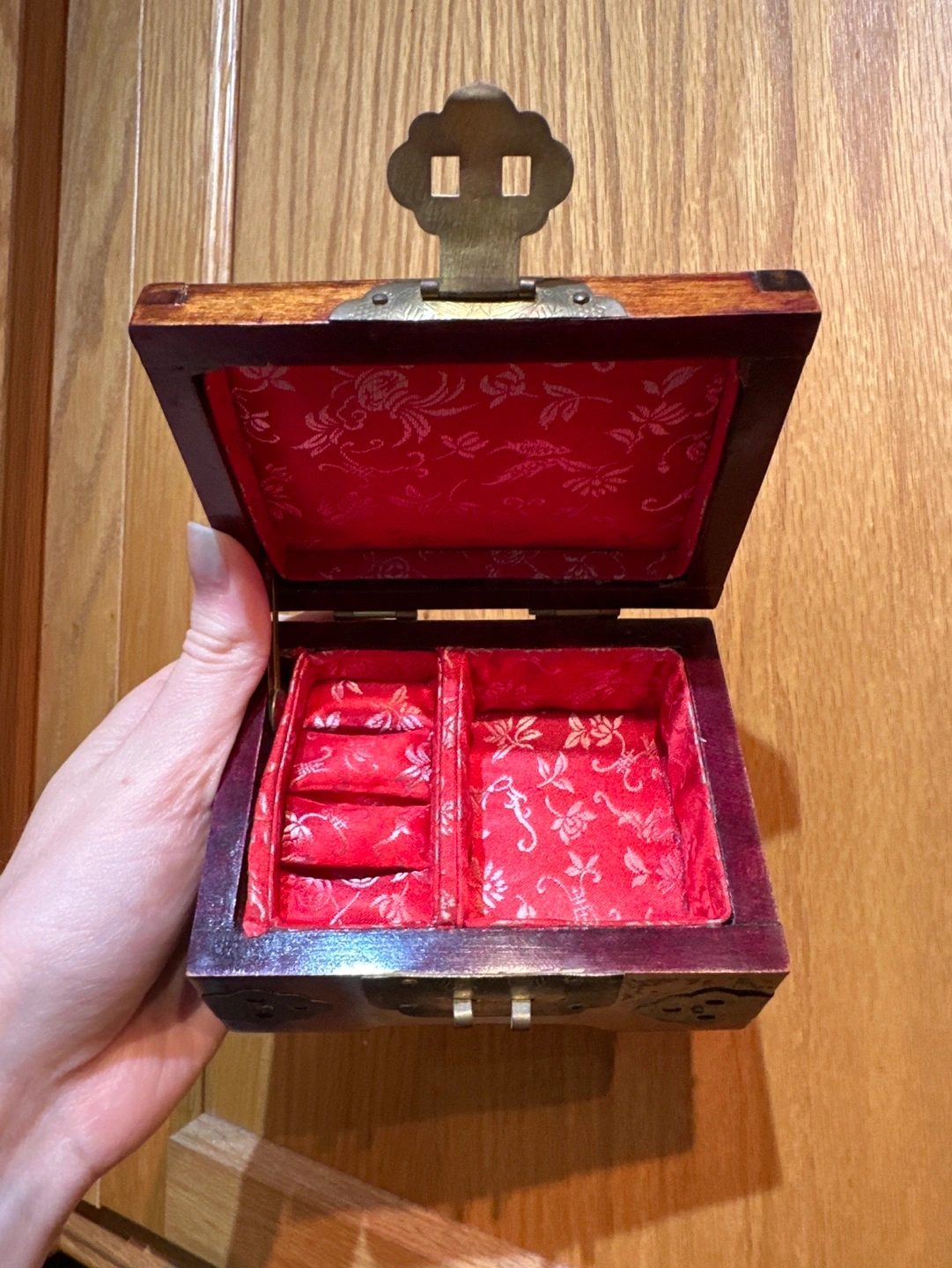Small wooden jewellery box with a brass latch and jade accents. The box is lined in red satin and has two internal compartments. Made in Shanghai, China. Pick up only.