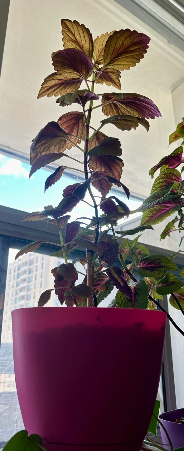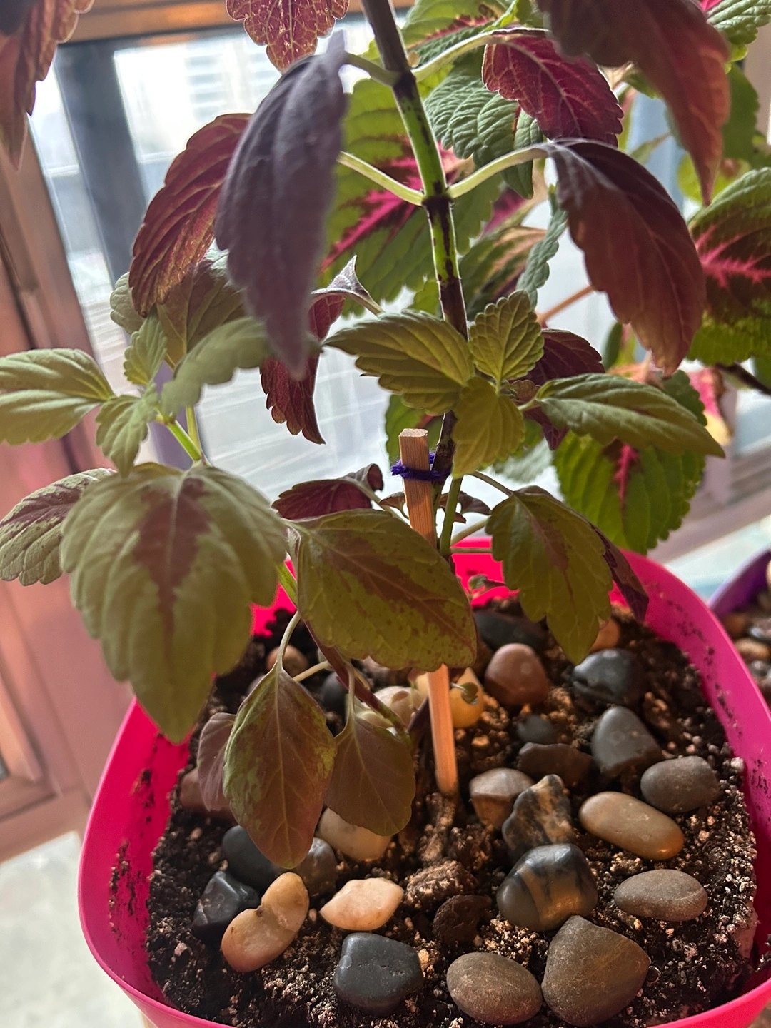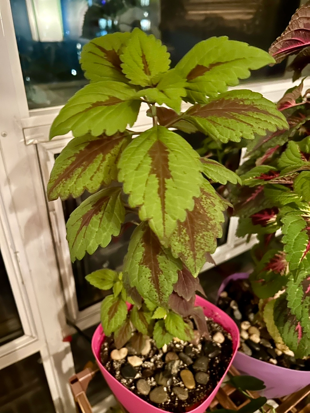 Green and red Coleus plant in a pink pot. It is about 12 inches tall. The leaves are variegated.