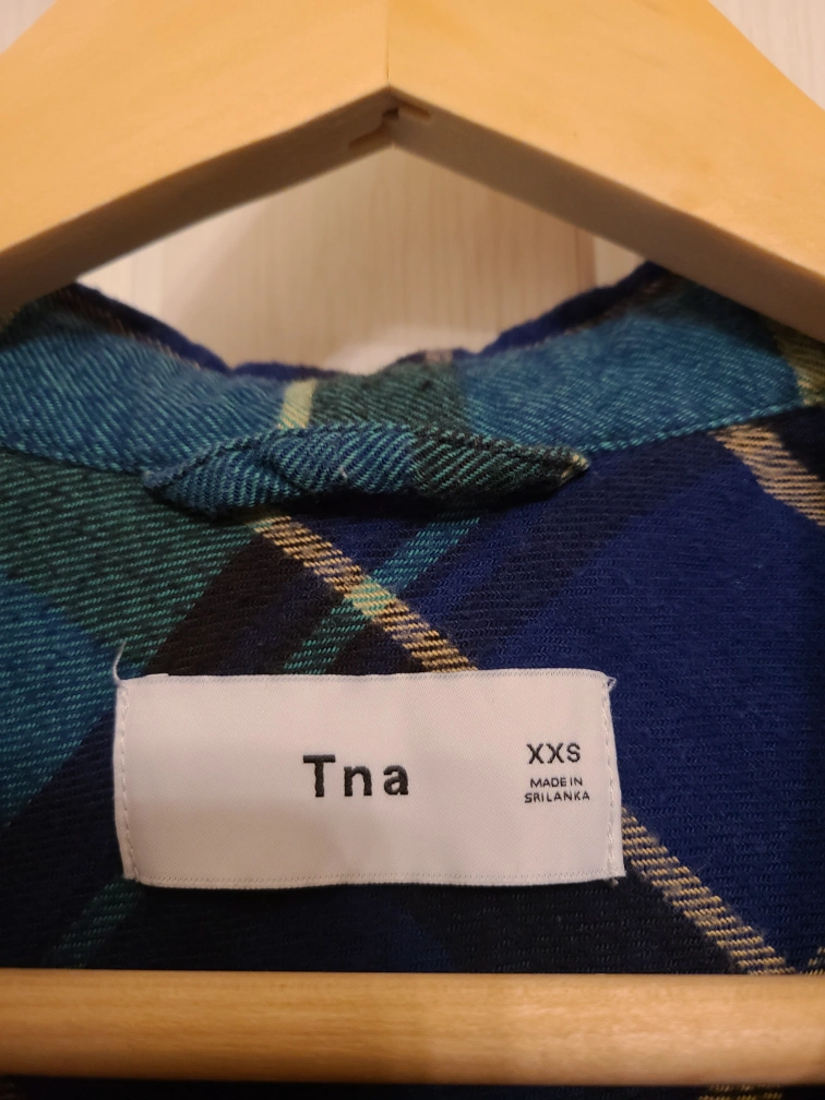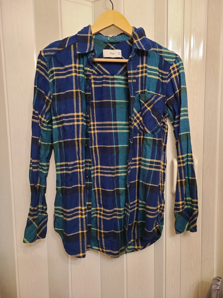 Long-sleeved plaid button up shirt. Features a chest pocket.