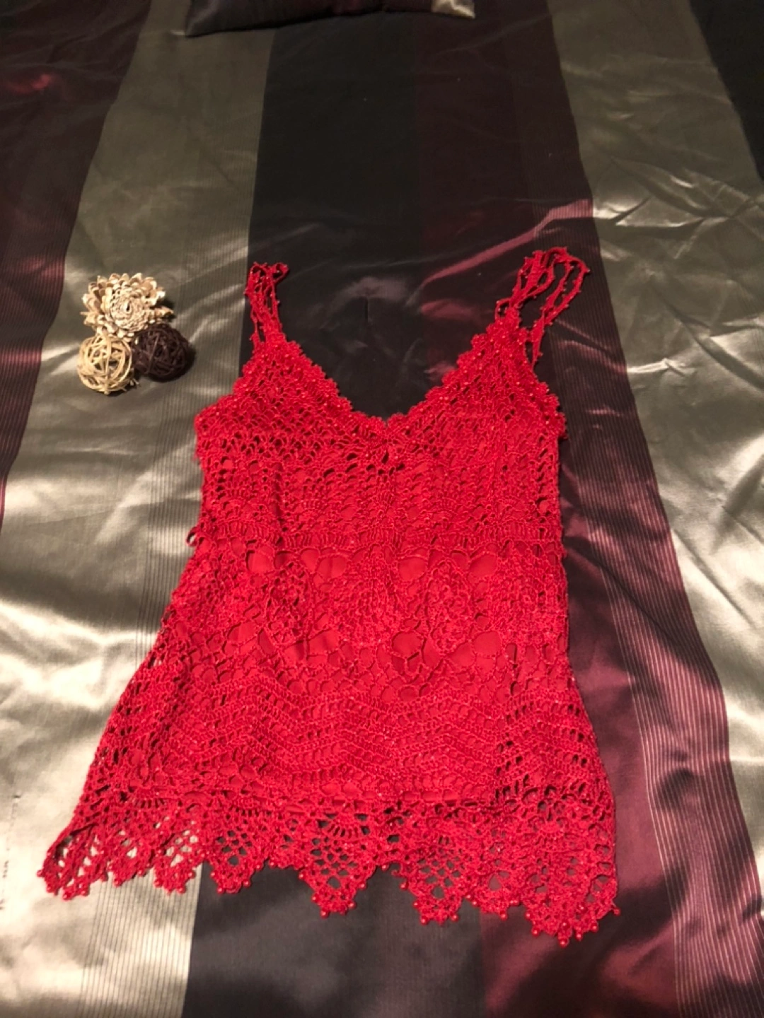 Great for the Christmas holiday! Red crochet tank top with beaded accents. Sleeveless and v-neck. Size: Large