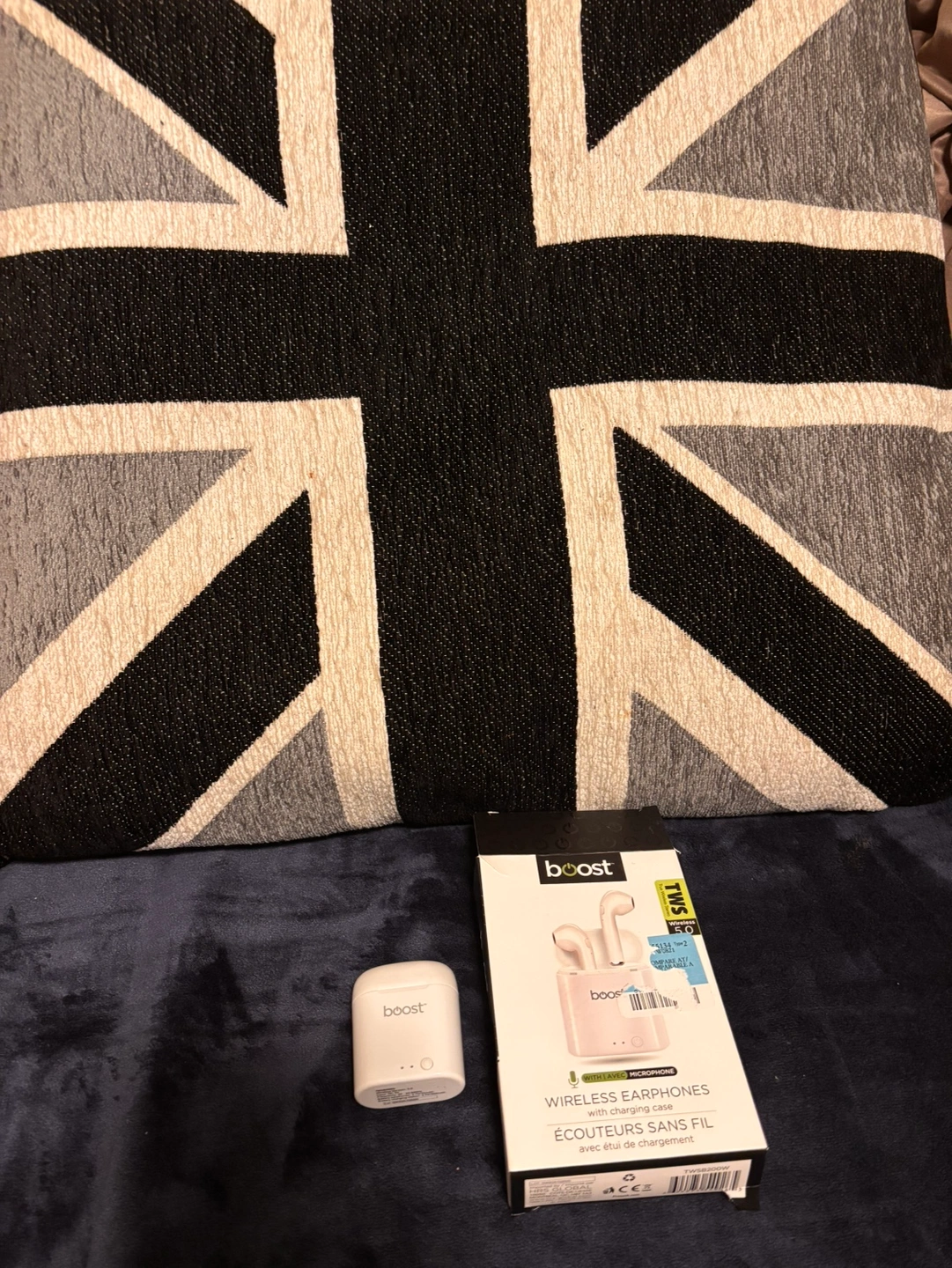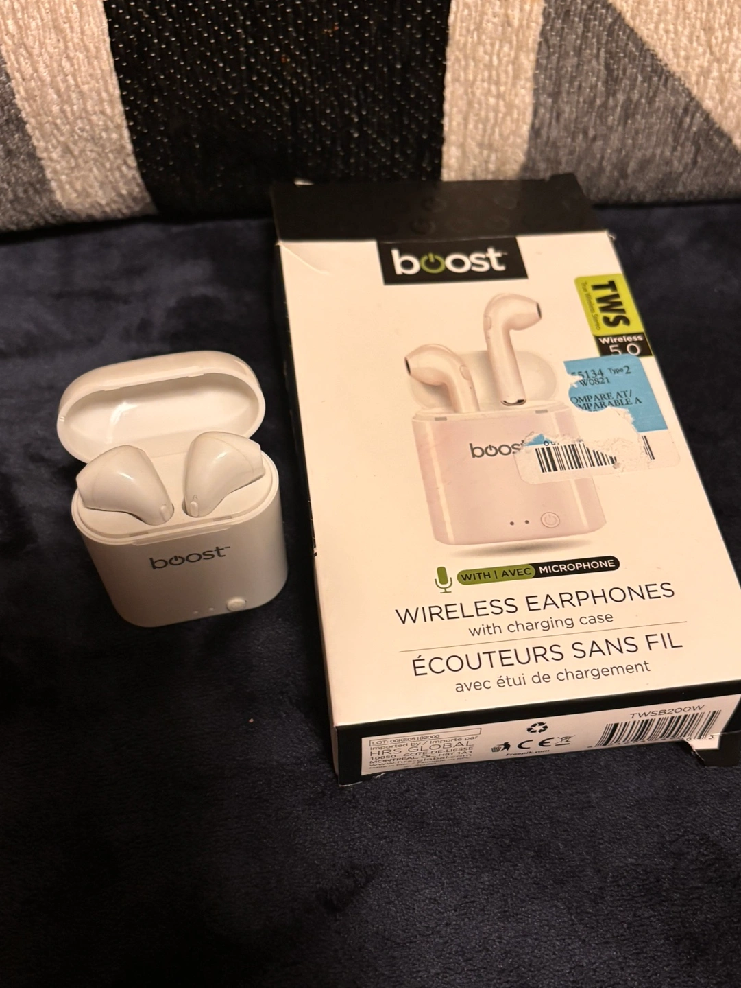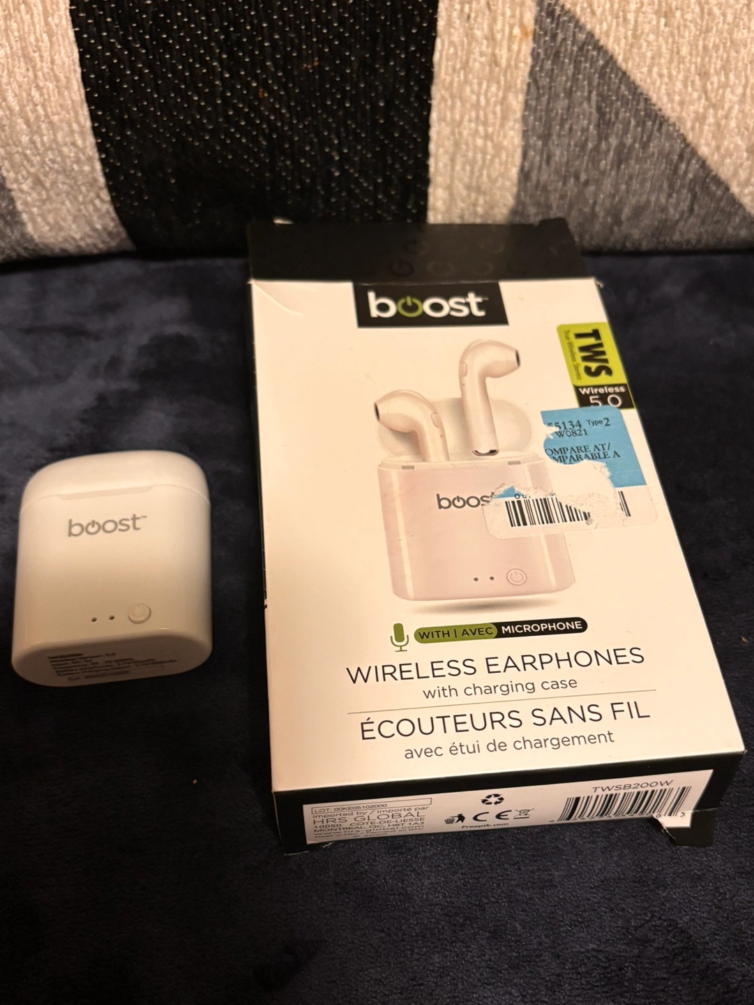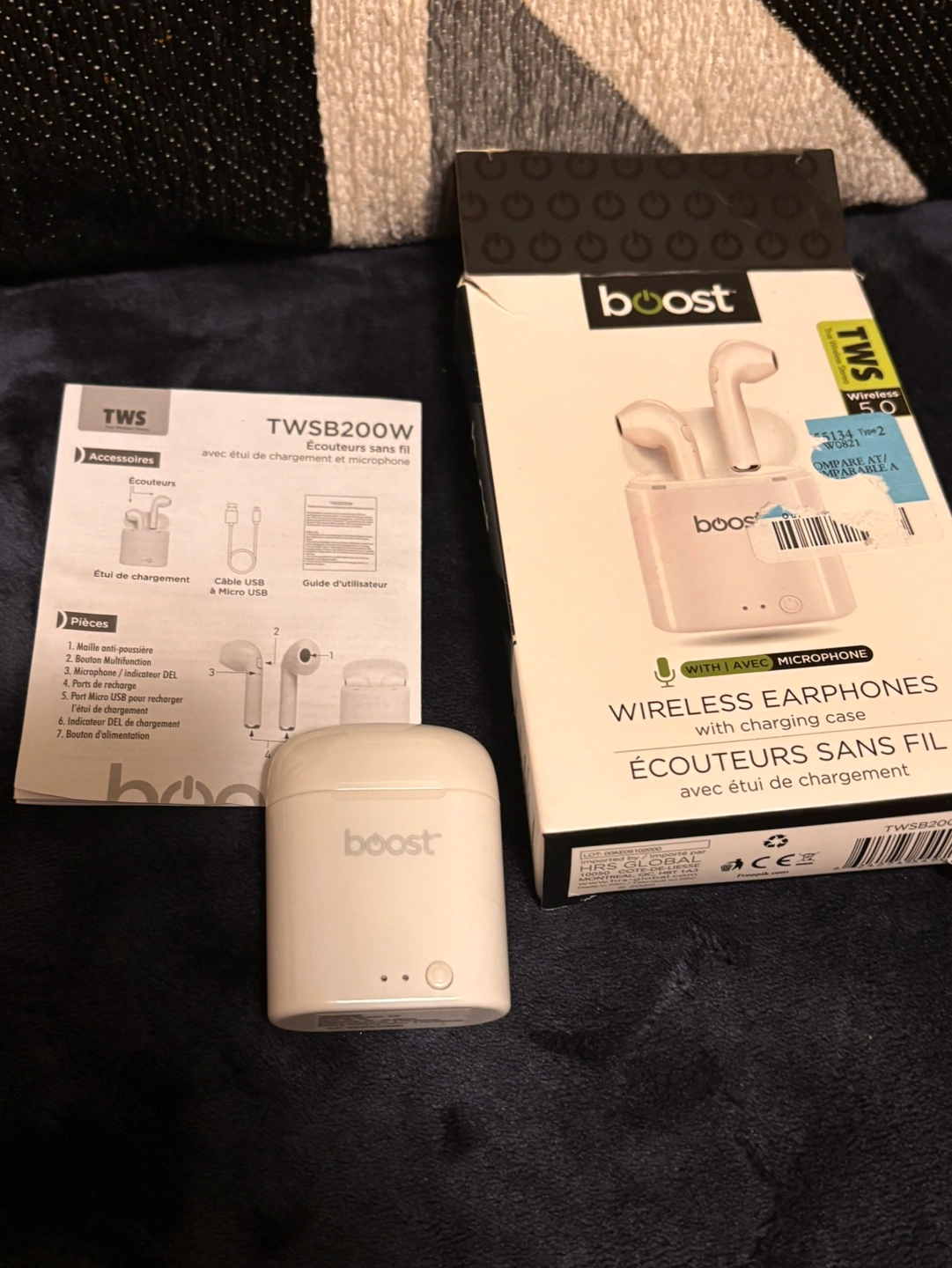 Wireless earbuds with charging case. Includes charging cable and instruction manual.