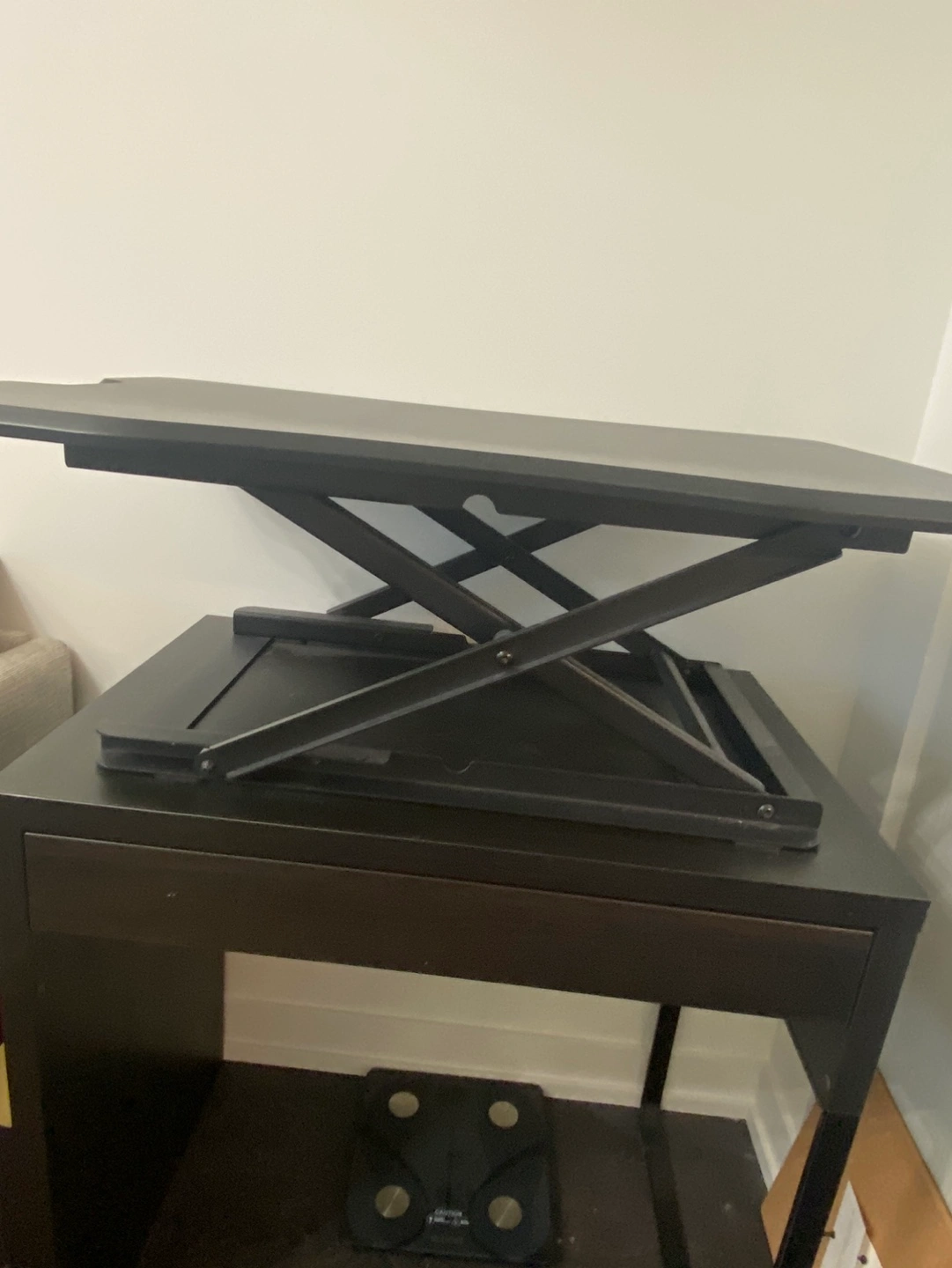 Black, adjustable height desktop workstation. 32in x 22in. Great condition. No installation or assembly required Ergonomic sit-stand desk with Top surface measuring 32 x 22 inches Height adjustable from 3.35 inches up to 15 inches Strong Sturdy Steel design with smooth and stable adjustability system Pick up-15 lower jarvis