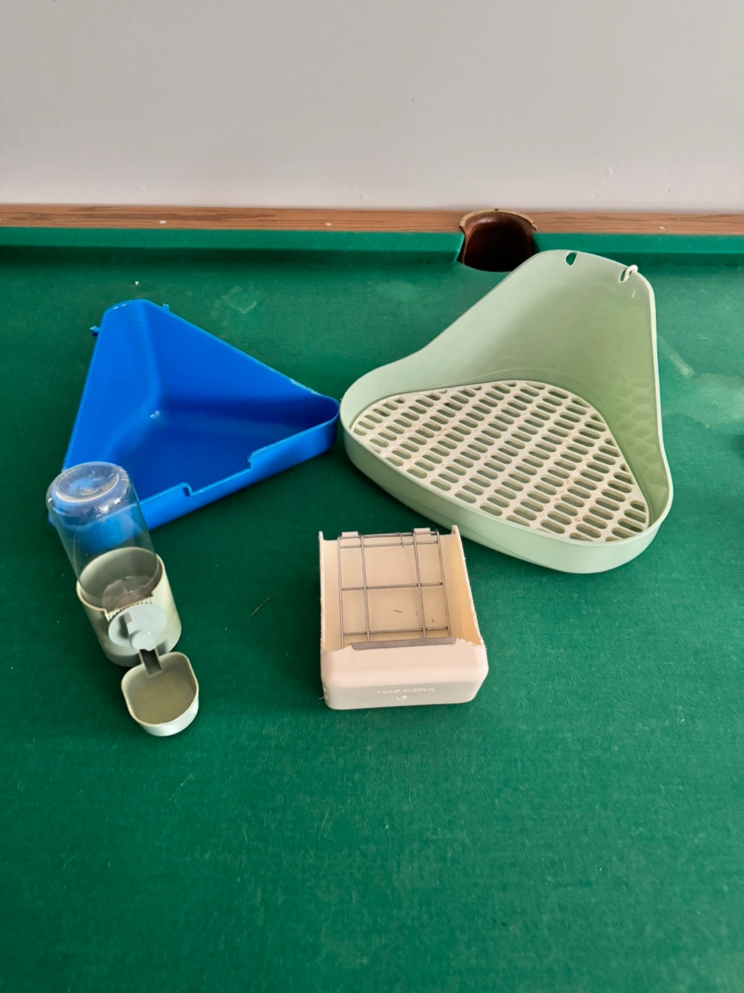 Can be used for rabbits, ferrets, guinea pigs etc SMALL LITTERBOX - Has some chewing damage on the rim LARGE LITTER PAN - Some stains but can be cleaned WATER DISPENSER *SOLD* HAY FEEDER - Some chewing damage