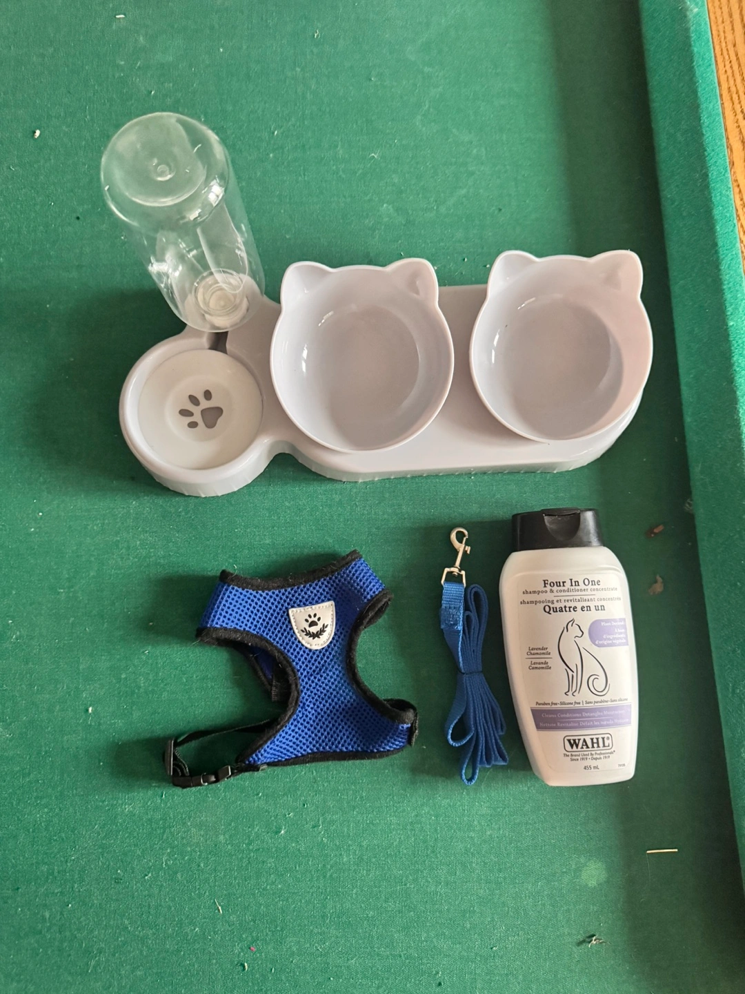 Attached Water/Food Bowls (Brand New) 1 Small Blue Harness + Leash (Excellent Condition) Cat Shampoo (Barely Used)