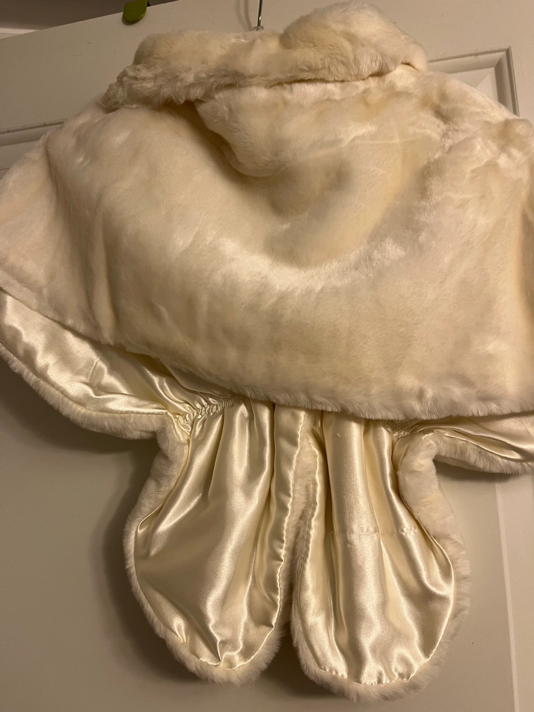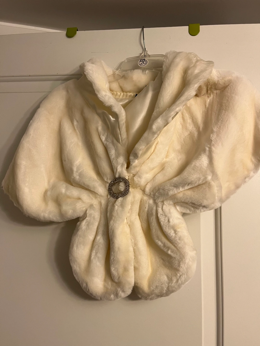 White faux fur bolero shrug with satin lining and a rhinestone brooch. Perfect for a wedding or special occasion.