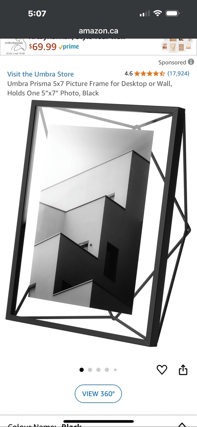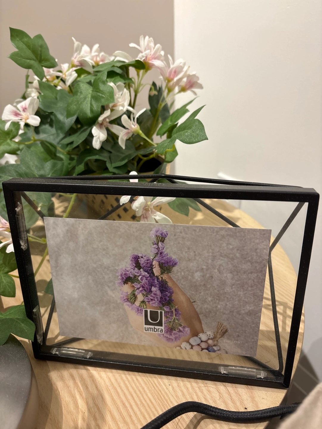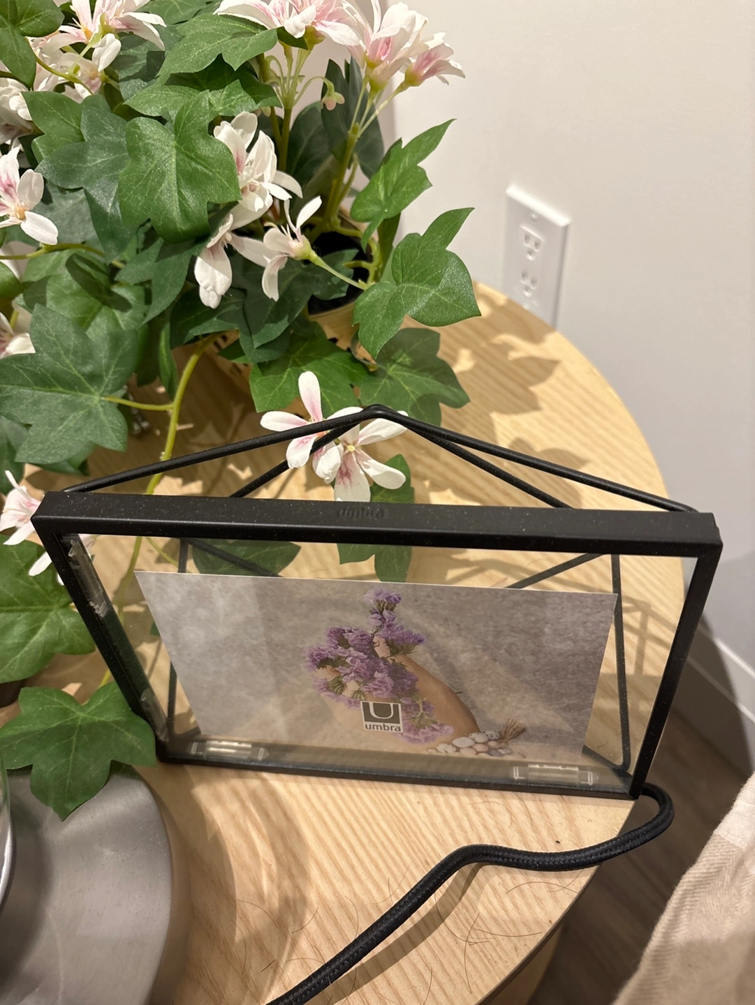 Black metal picture frame. Holds one 5x7 photo. Can be used on a desk or on the wall.