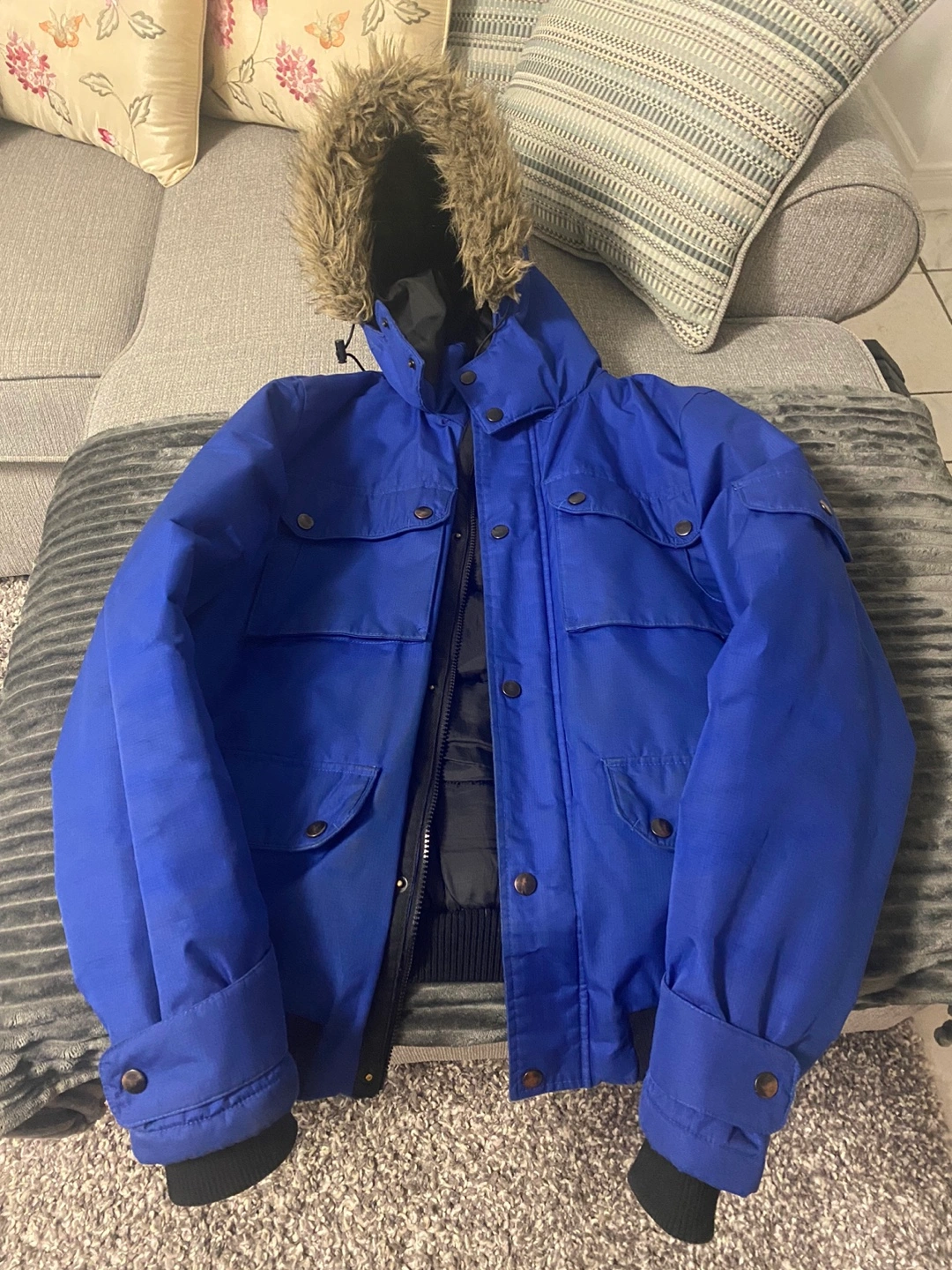 Blue winter jacket with fur hood and multiple pockets. Zipper closure with button overlay. Size Medium.