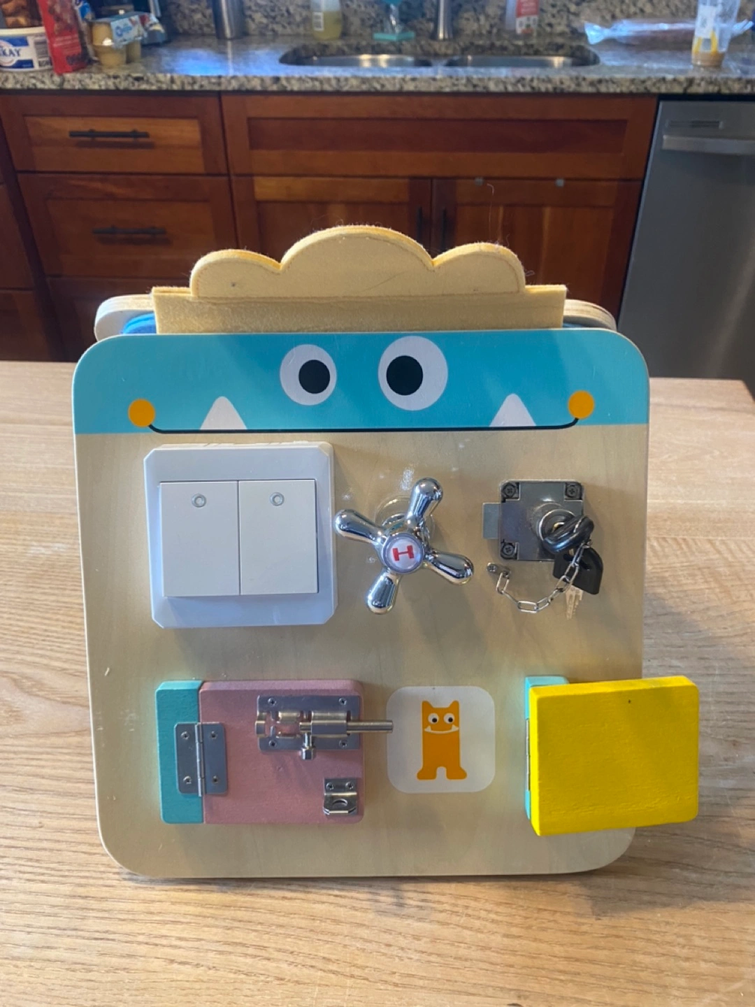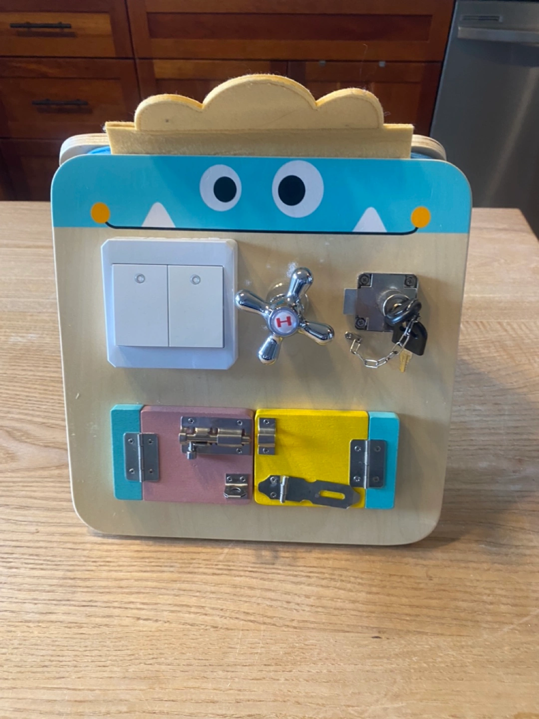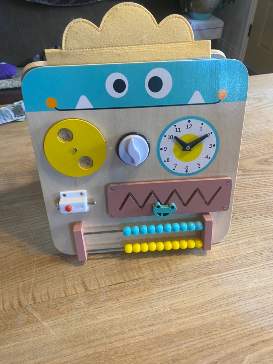 Wooden busy board with a variety of activities for toddlers. Includes buckles, zippers, laces, a clock, an abacus, a key, a lock, and more.