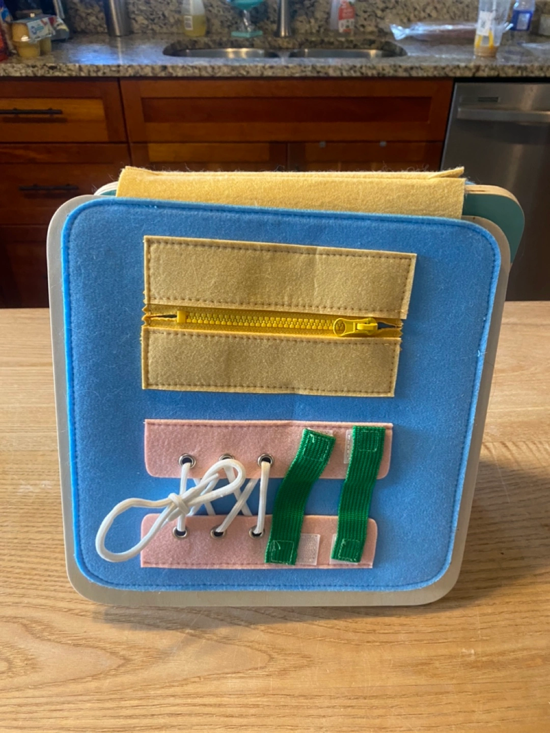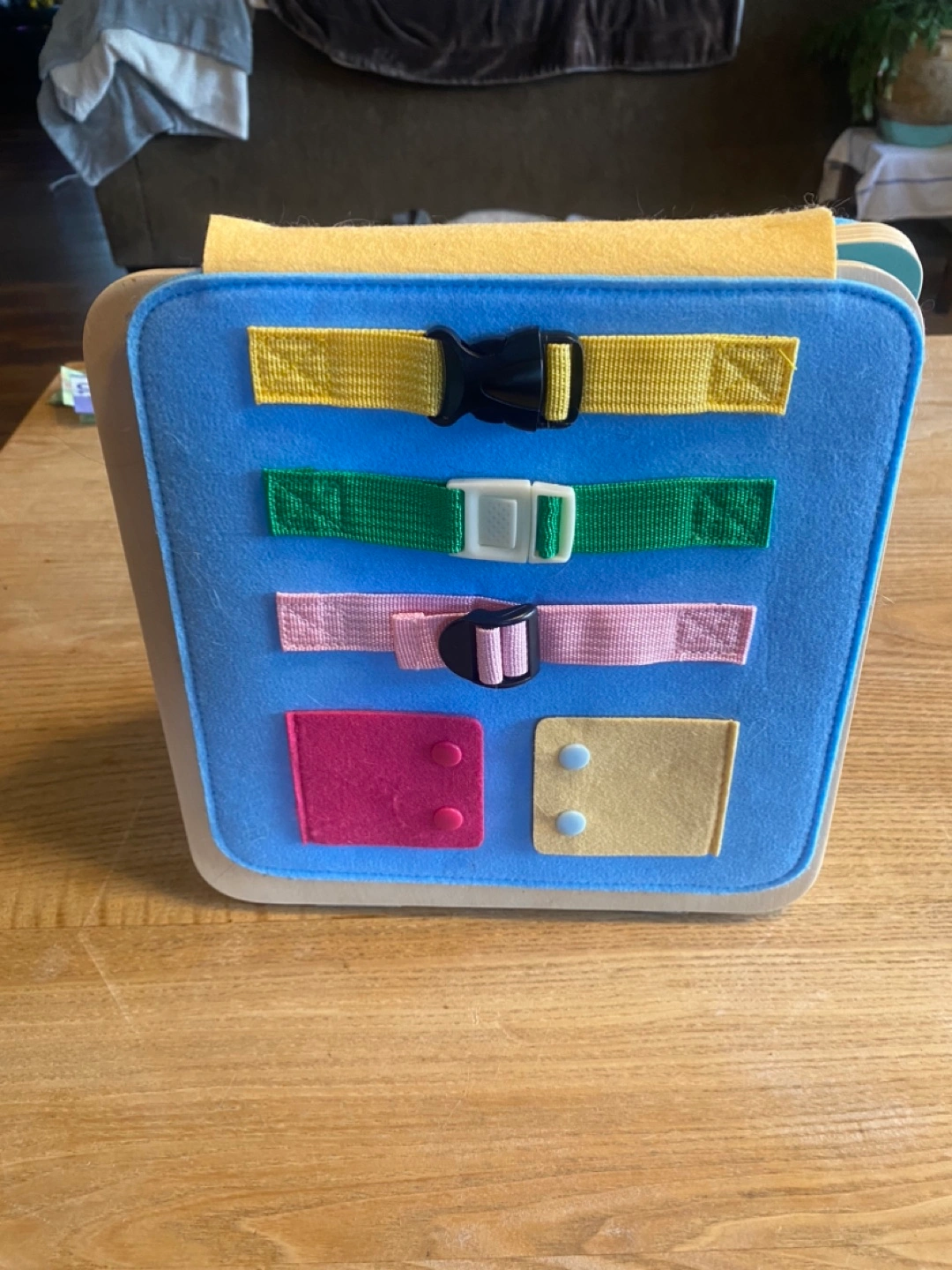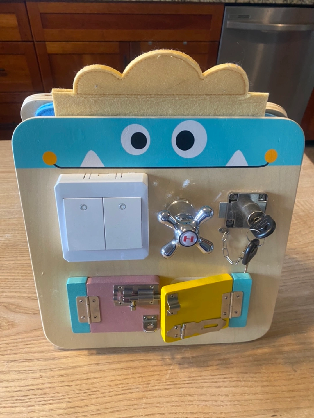 Wooden busy board with a variety of activities for toddlers. Includes buckles, zippers, laces, a clock, an abacus, a key, a lock, and more.