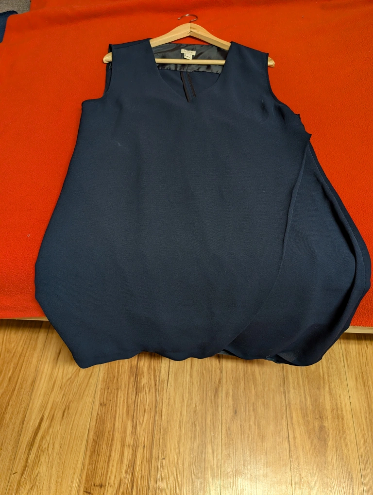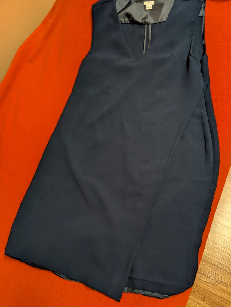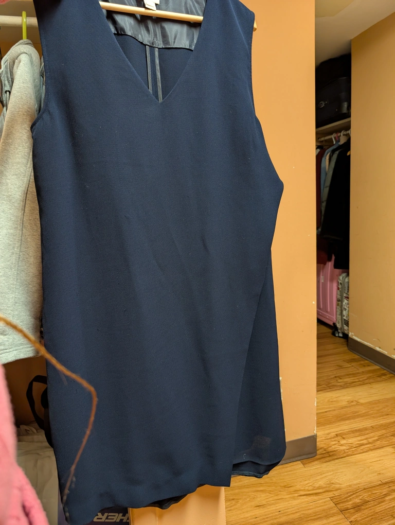 Navy blue sleeveless dress with a V-neck. The dress has a wrap-style design.