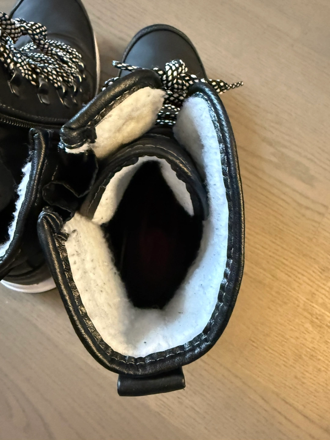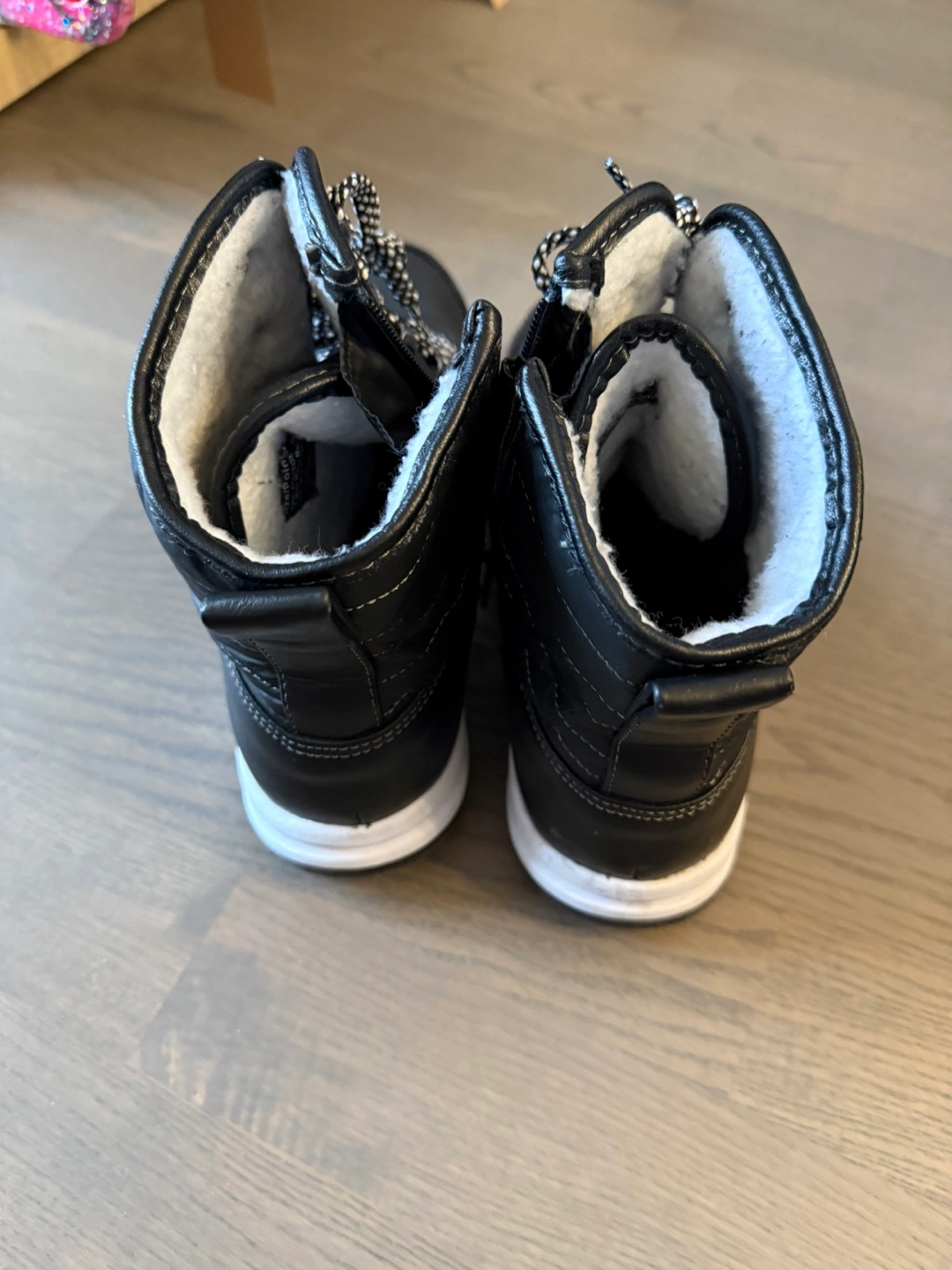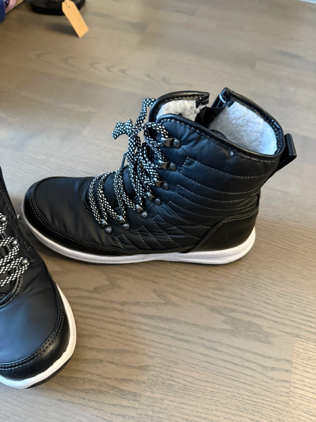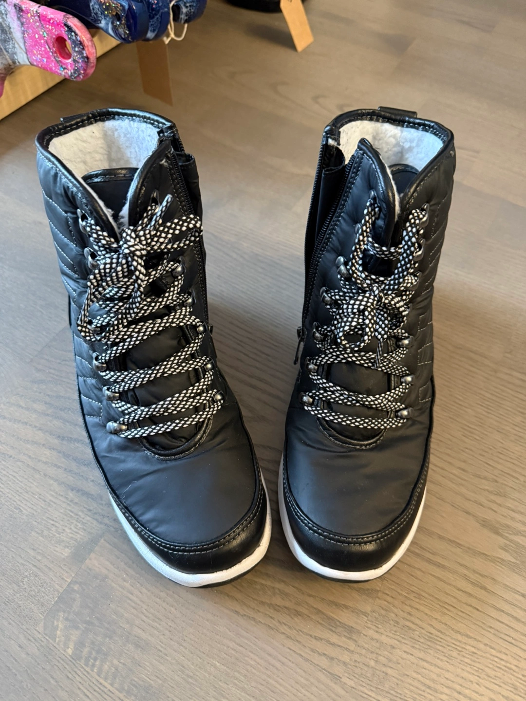 Black winter boots with white soles and white and black laces. Fleece lining. Like new