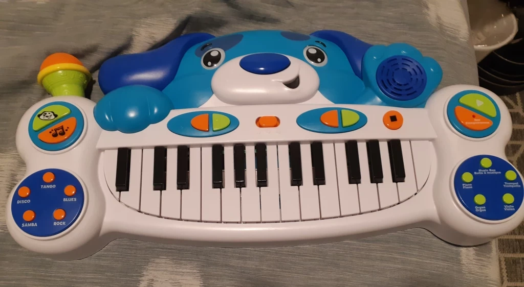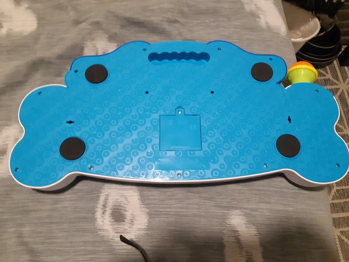 Blue and white learning walker, features a piano with musical styles and a microphone. Suitable for babies who are learning to walk Brand: Spark Create Material: Plastic Theme: Animal Item dimensions L x W x H 25.4 x 12.7 x 15.2 Centimetres Instrument: Piano Mic: loud. Power: Battery