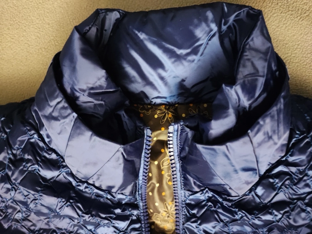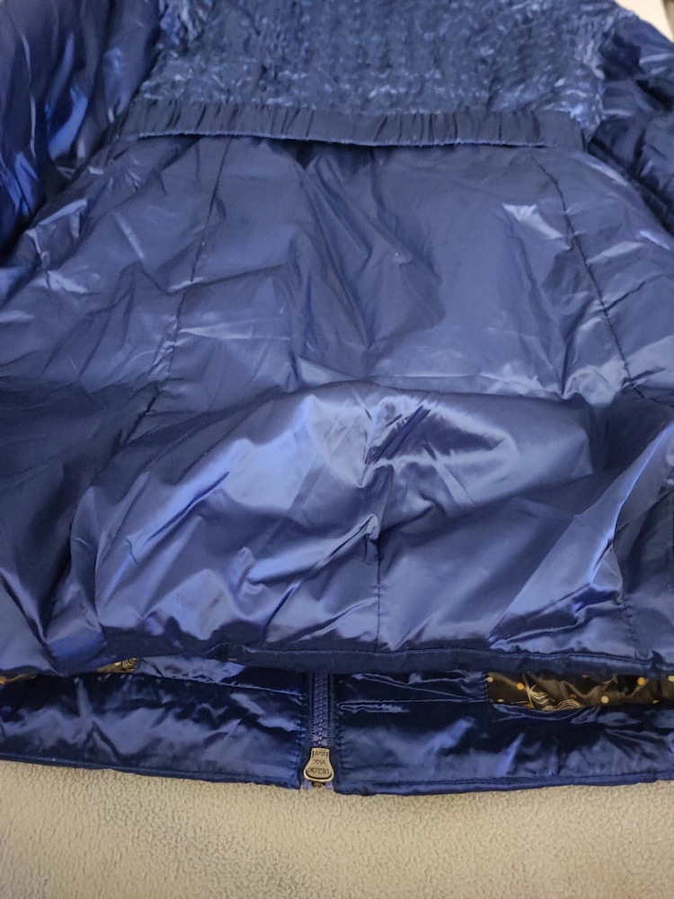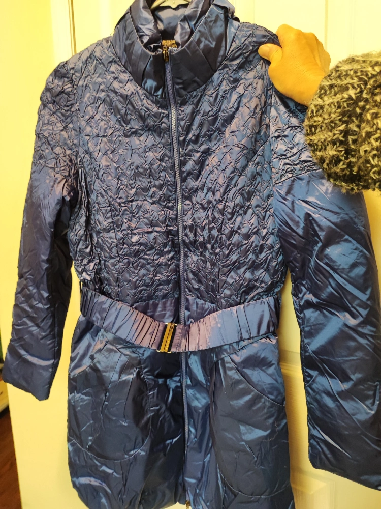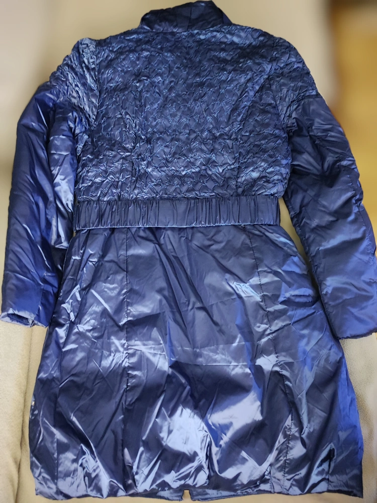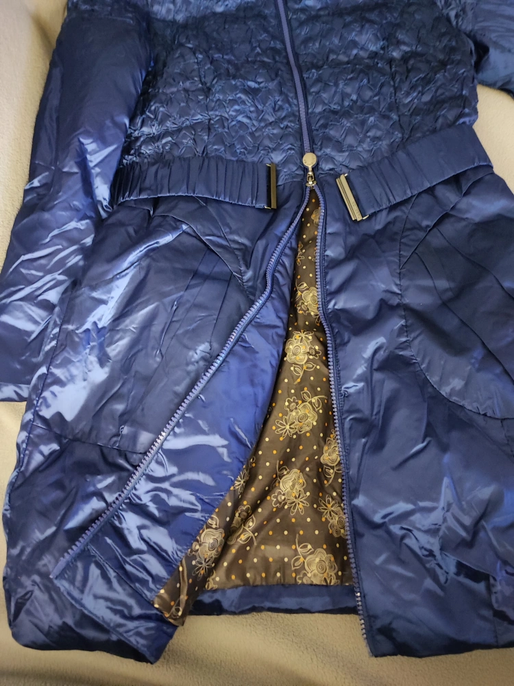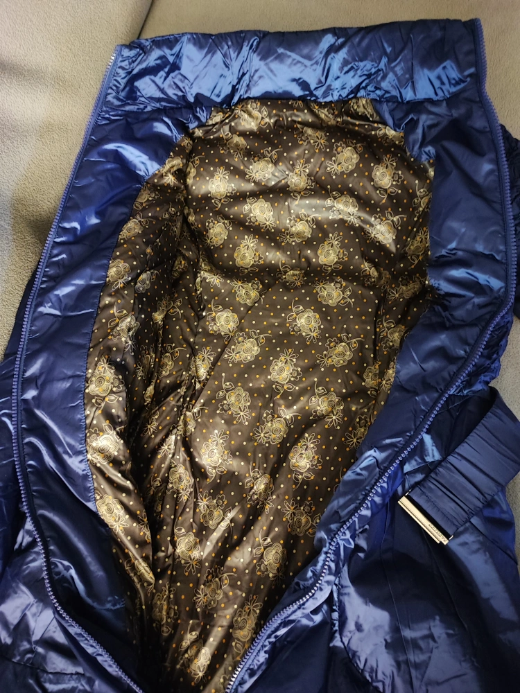 Blue puffer jacket with a belt, long sleeves and a zipper closure. The jacket has a quilted design and a floral lining.