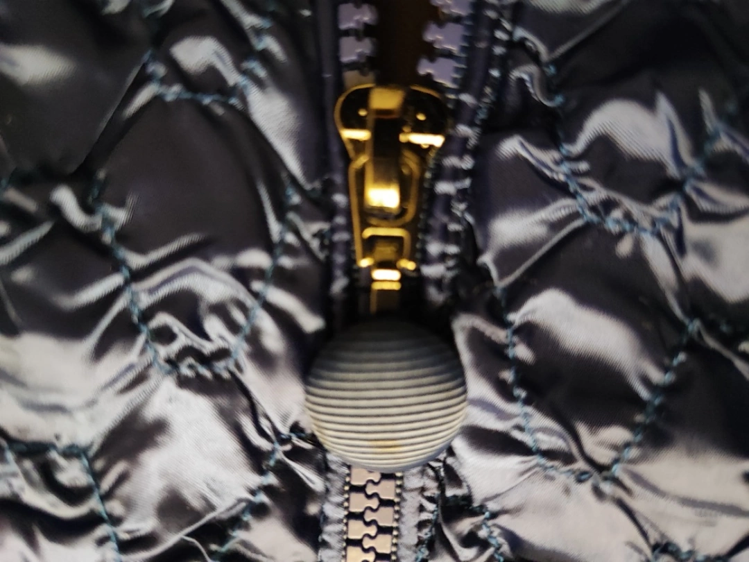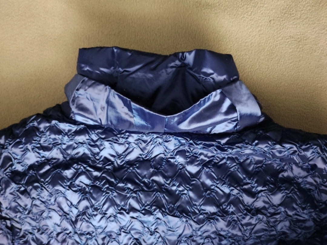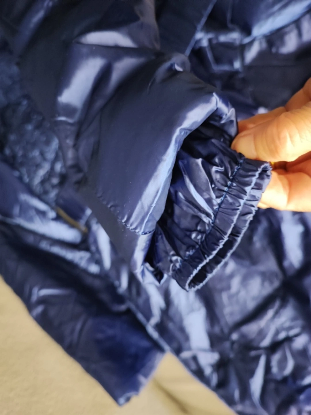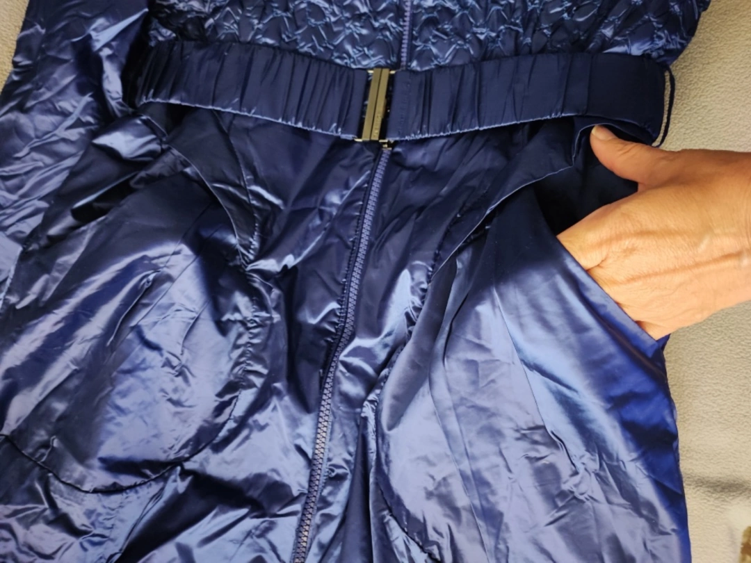 Blue puffer jacket with a belt, long sleeves and a zipper closure. The jacket has a quilted design and a floral lining.
