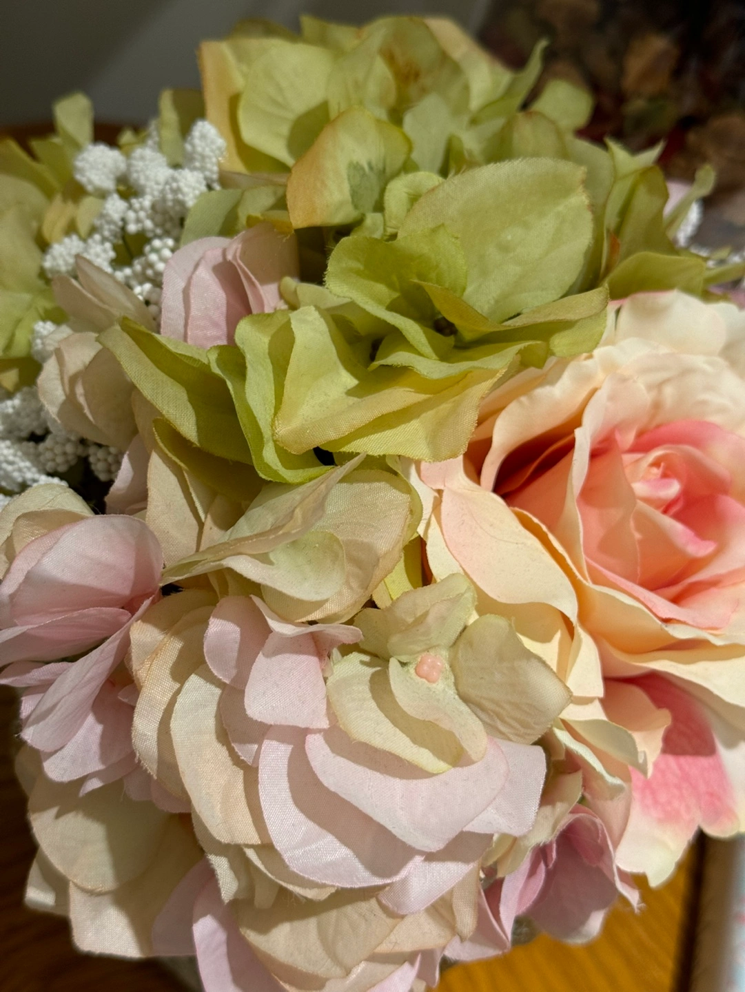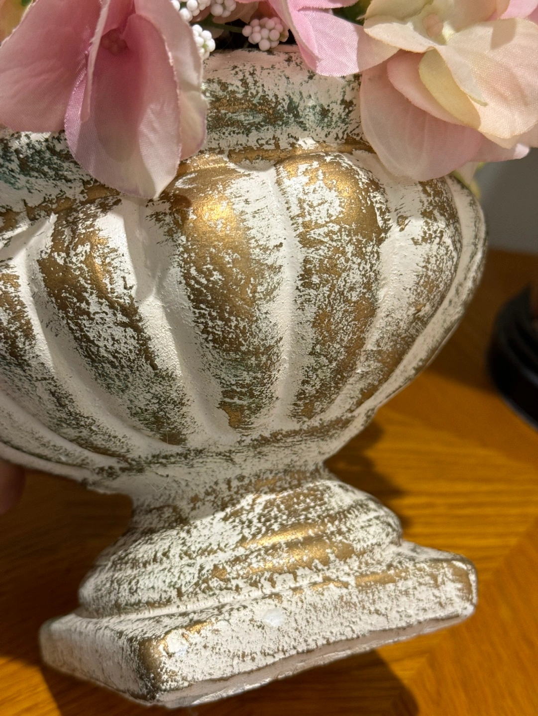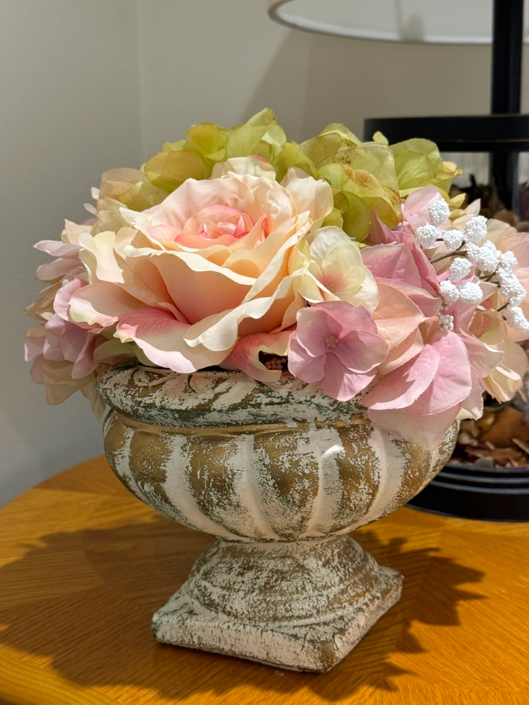 Artificial flower arrangement in a distressed gold vase. Features pink roses, hydrangeas and white baby's breath. Suitable for a small side table or shelf.