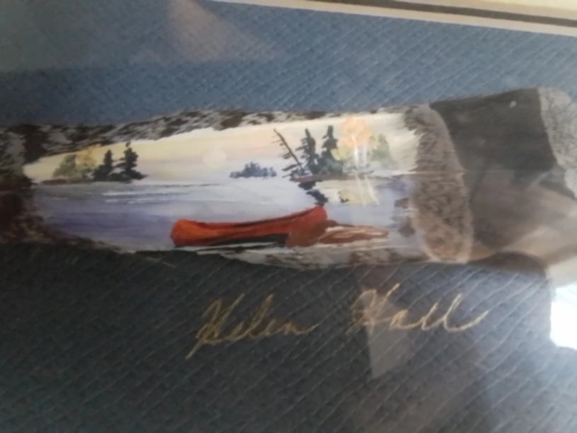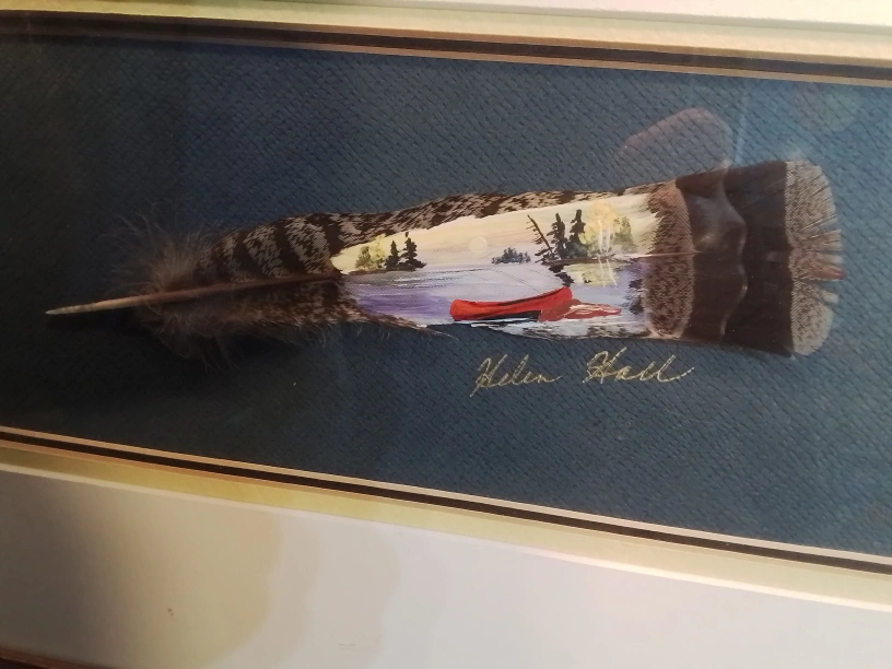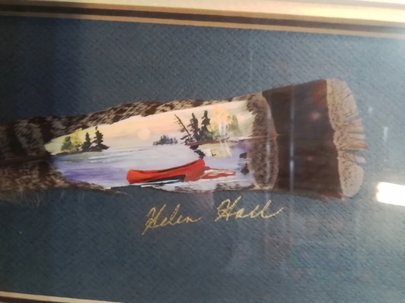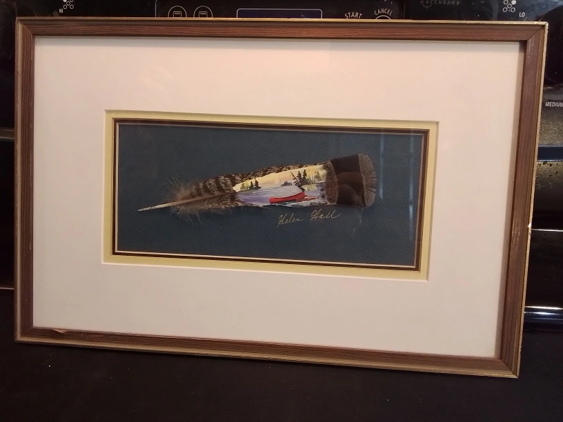 Framed Feather Art - Helen Hall A framed piece of feather art with a painted scene of a canoe on a lake. The piece is signed by the artist, Helen Hall. The feather is encased in a simple brown frame. A very nice oil painting. Condition: Good Condition Measurements: 14 by 9.5 inches framed Pickup at Young Street and Steels Ave
