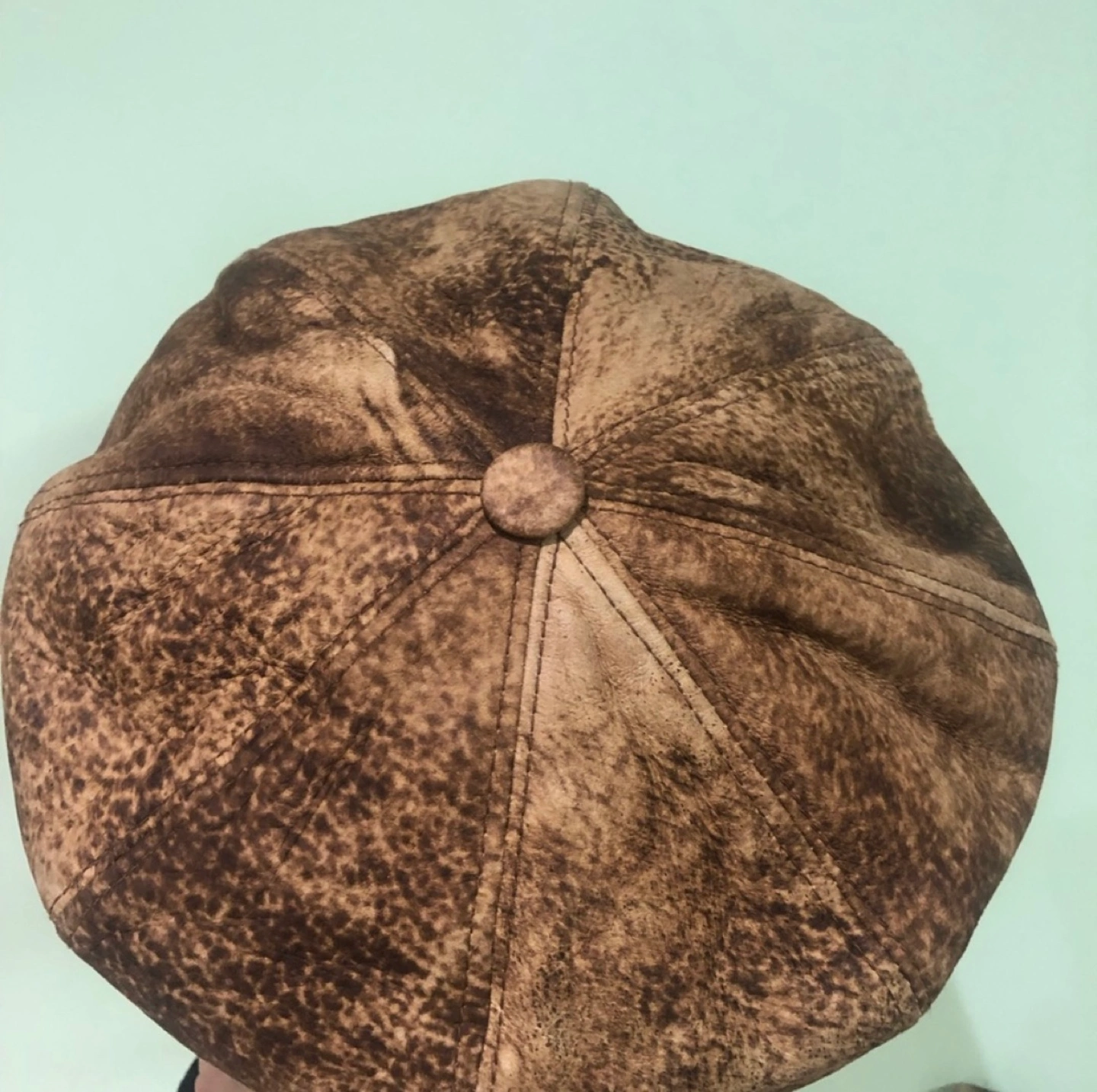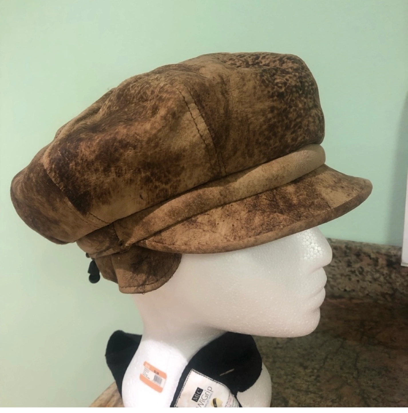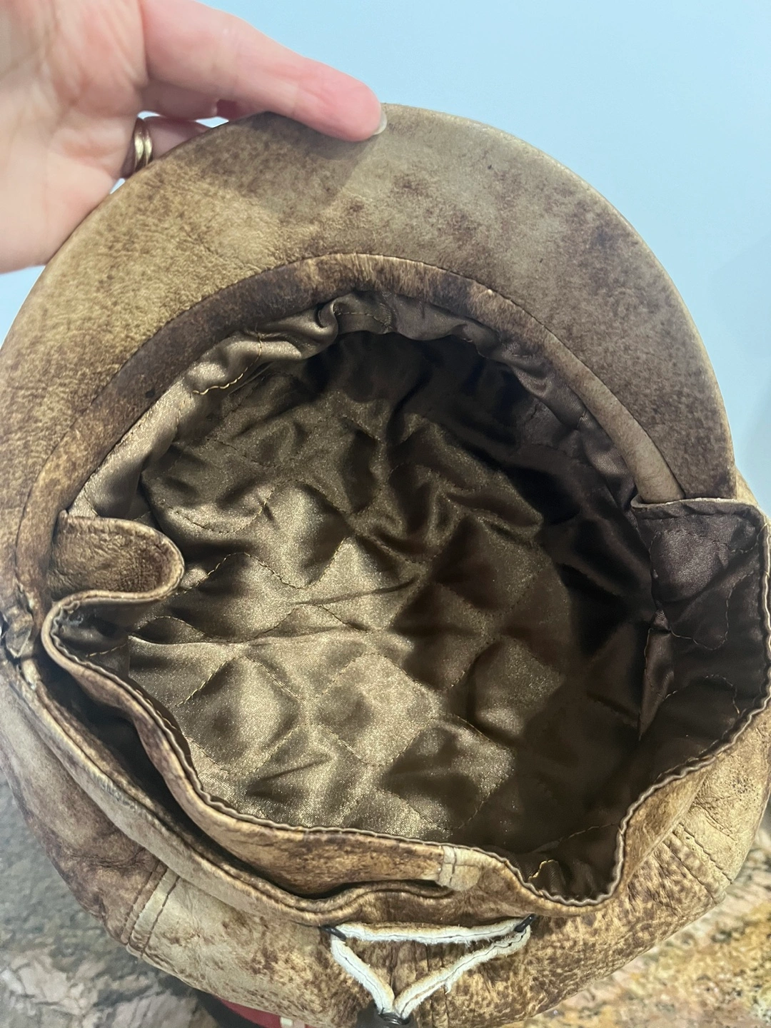 Brown leather hat with a brown satin lining. Features a drawstring closure and a button on top. Adjustable. Brand new. Dufferin and Steeles is the main intersection