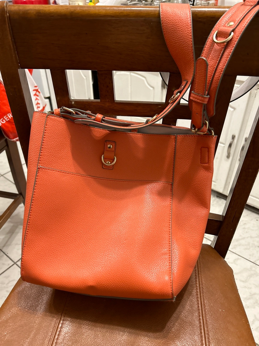 Orange satchel handbag with adjustable strap. Grey interior. Zipper pocket