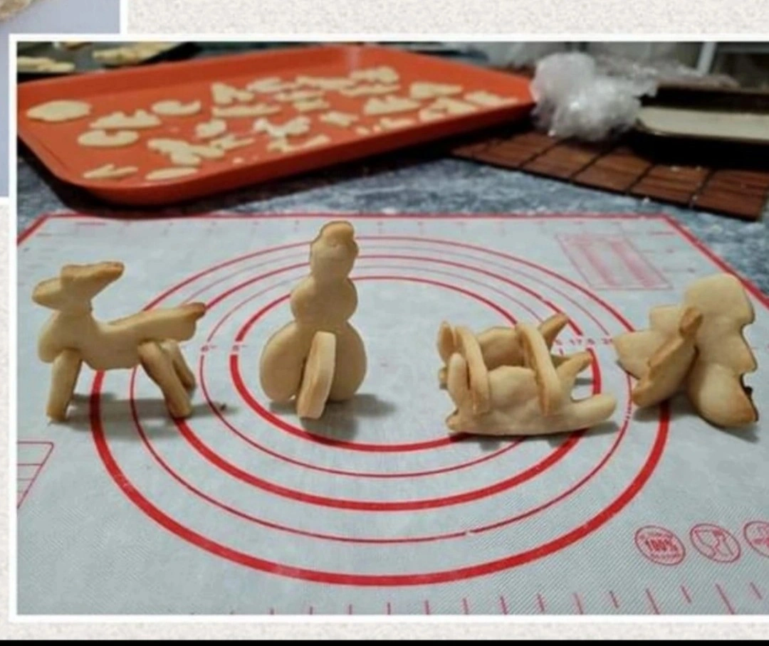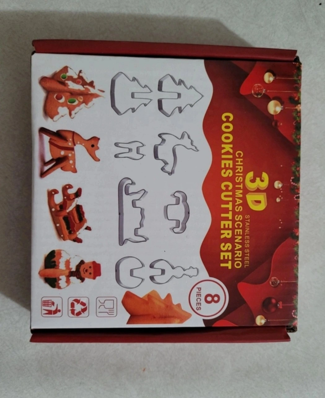 Set of 8 stainless steel cookie cutters. Includes a reindeer, snowman, sleigh, and a few trees. Perfect for holiday baking.