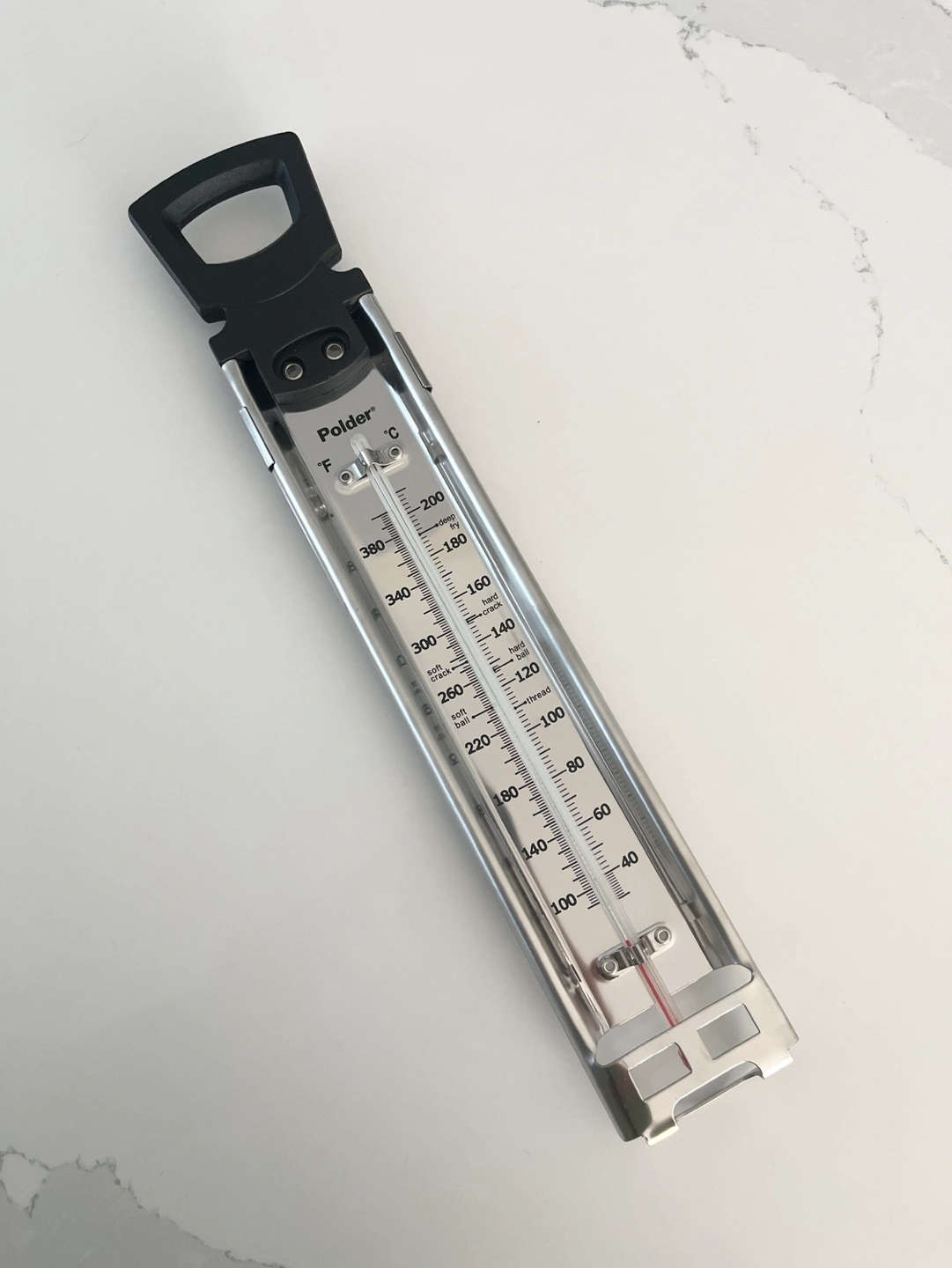 Candy thermometer with both Fahrenheit and Celsius scales. Can be used right in the pot to test temps for anything being cooked, not just for candy. Never used!