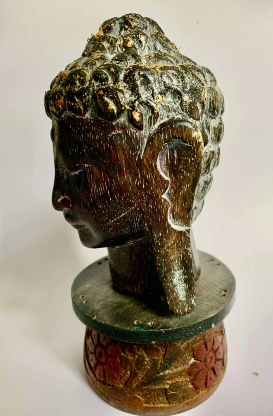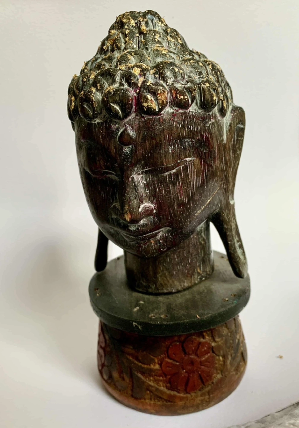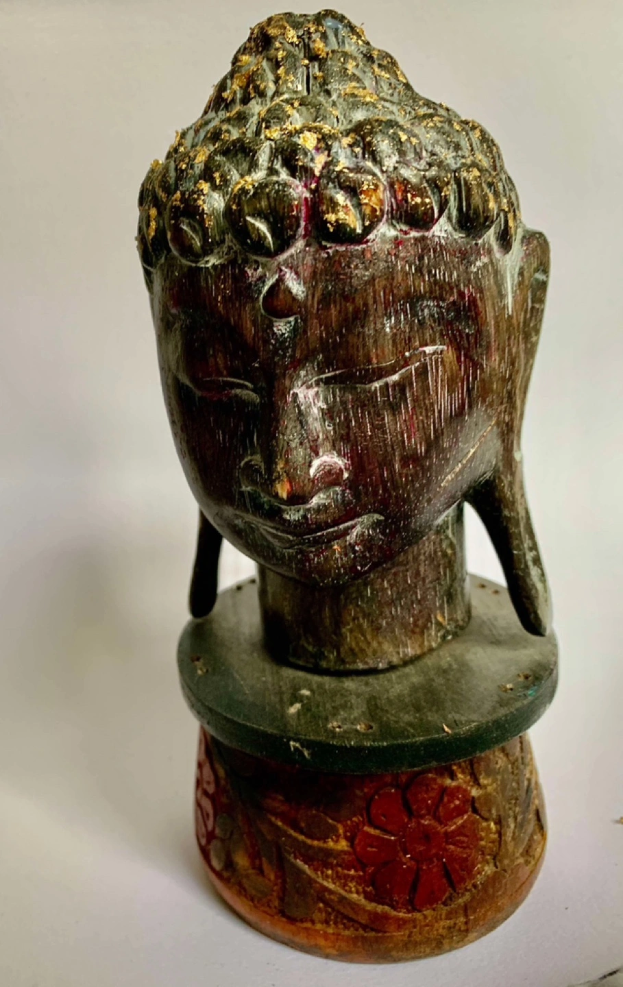 Carved wooden statue of a Buddha head. Gold leaf accents. Small base.