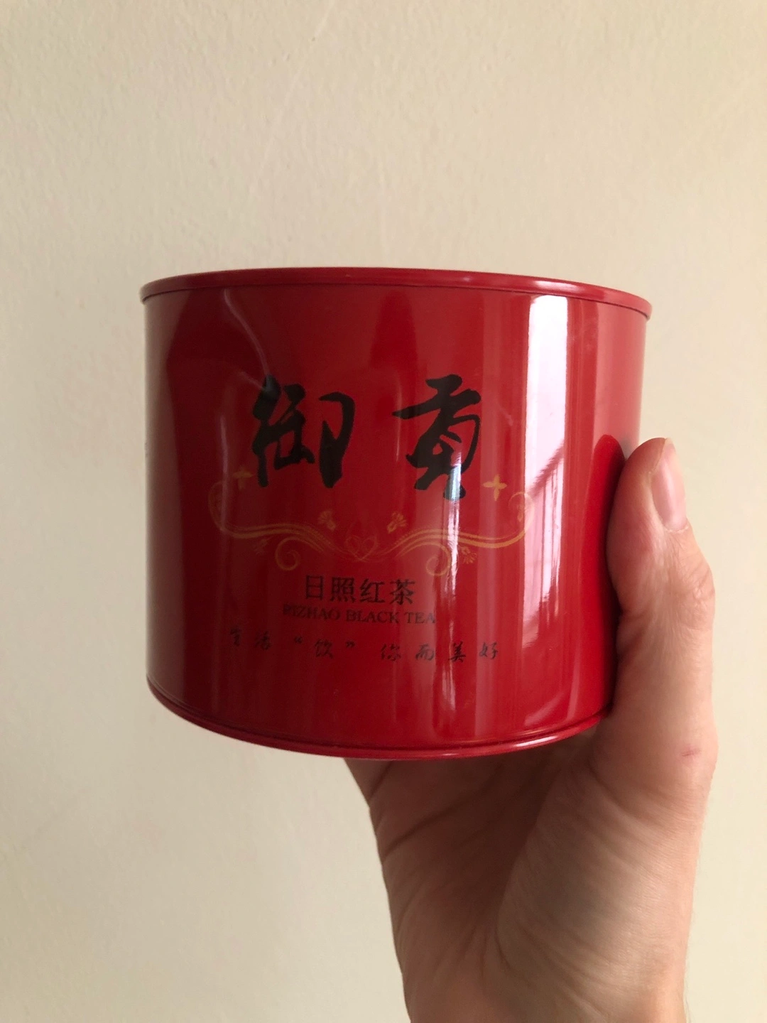 Red tin with black tea leaves. Was a gift from a colleague but I prefer other types of tea