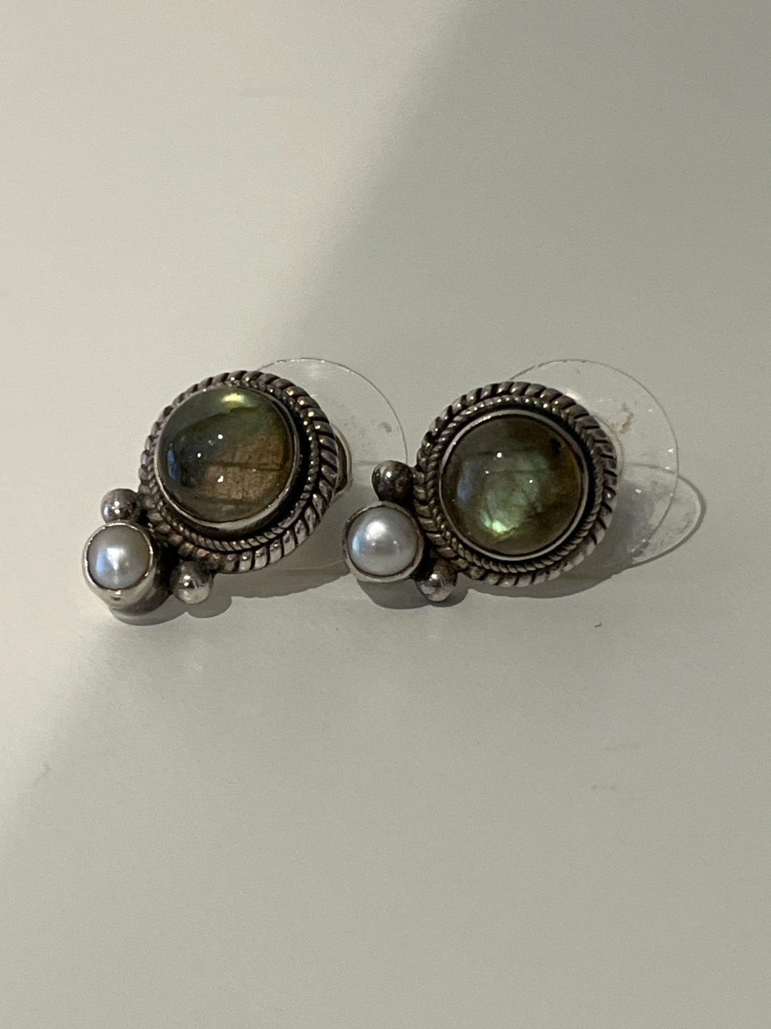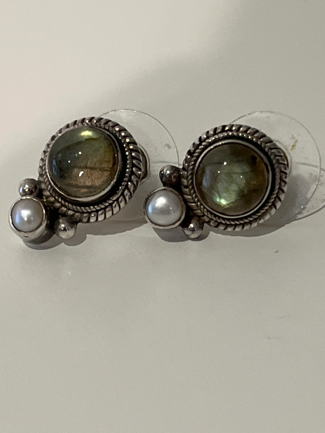 Sterling silver earrings with labradorite and pearl accents. Post backings.