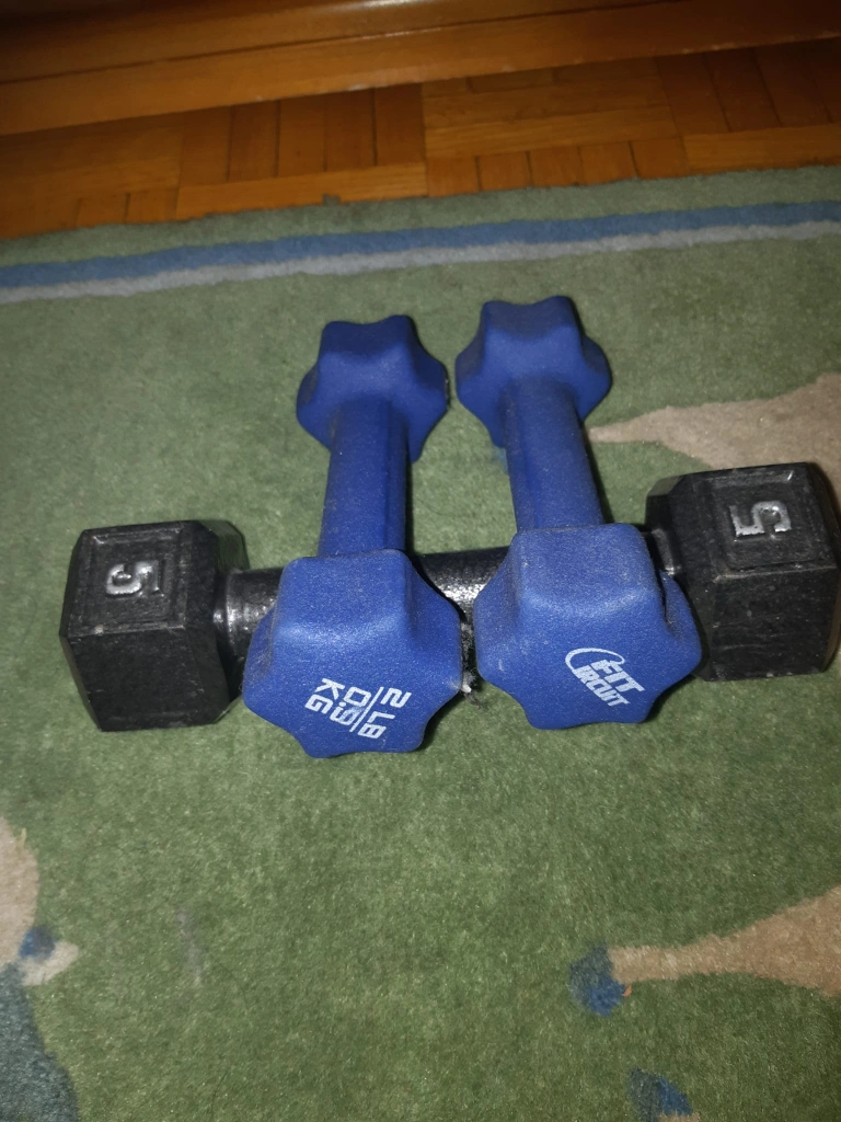 1×5lb dumbbell and 2 blue rubber coating 2lbs dumbbells