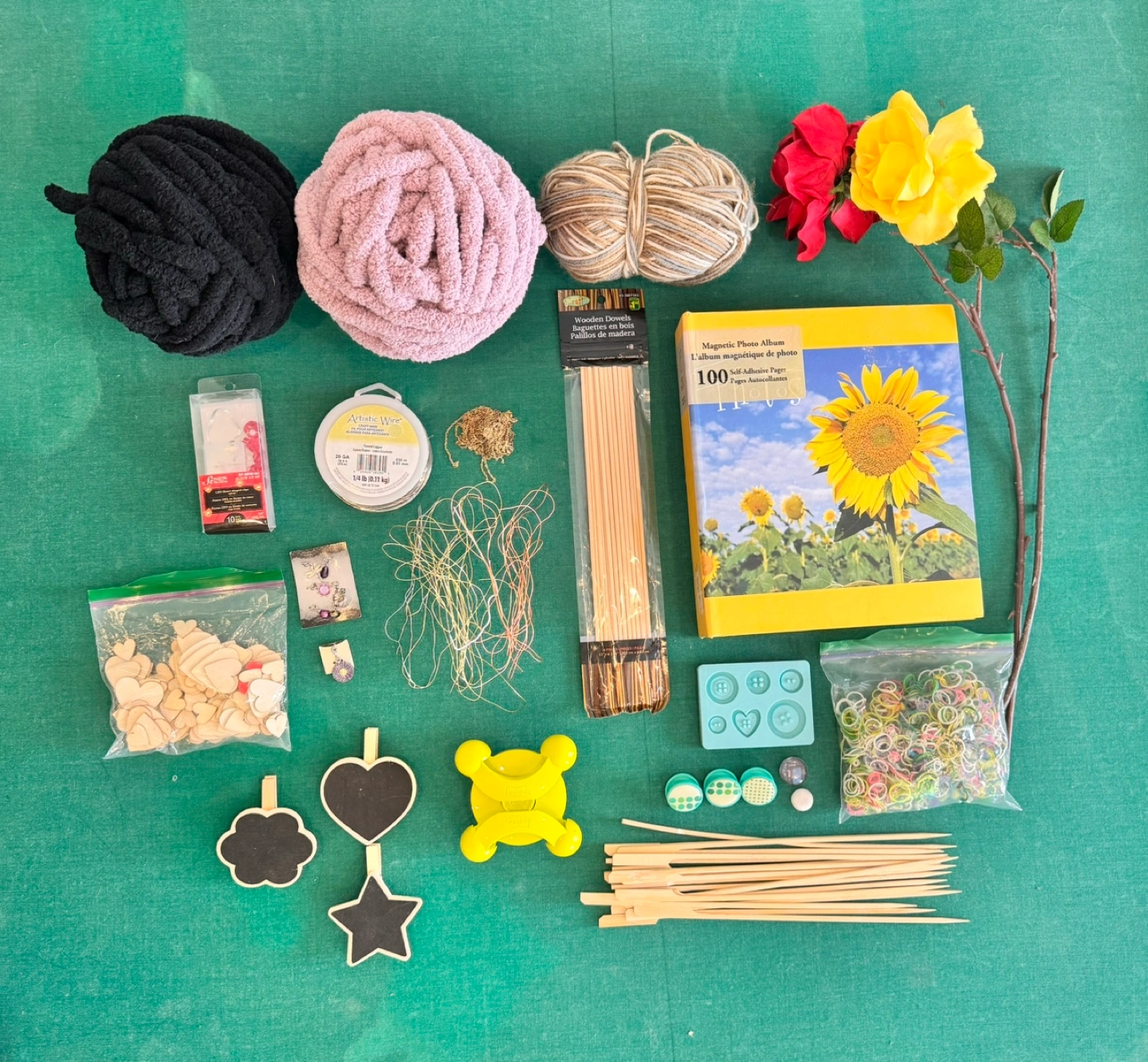 3 Yarn Magnets 2 Types of Dowels 2 Fake Flowers Gold Jewelry Chain Different Jewelry Wires Big and Small Wood Hearts Button Mold Post It Note Holder Red Heart Lights Rainbow Loom Bands + Hooks Magnetic Photo Album Purple and Silver Jewelry Charms 3 Chalkboard Clips 2 Small Extension Spings