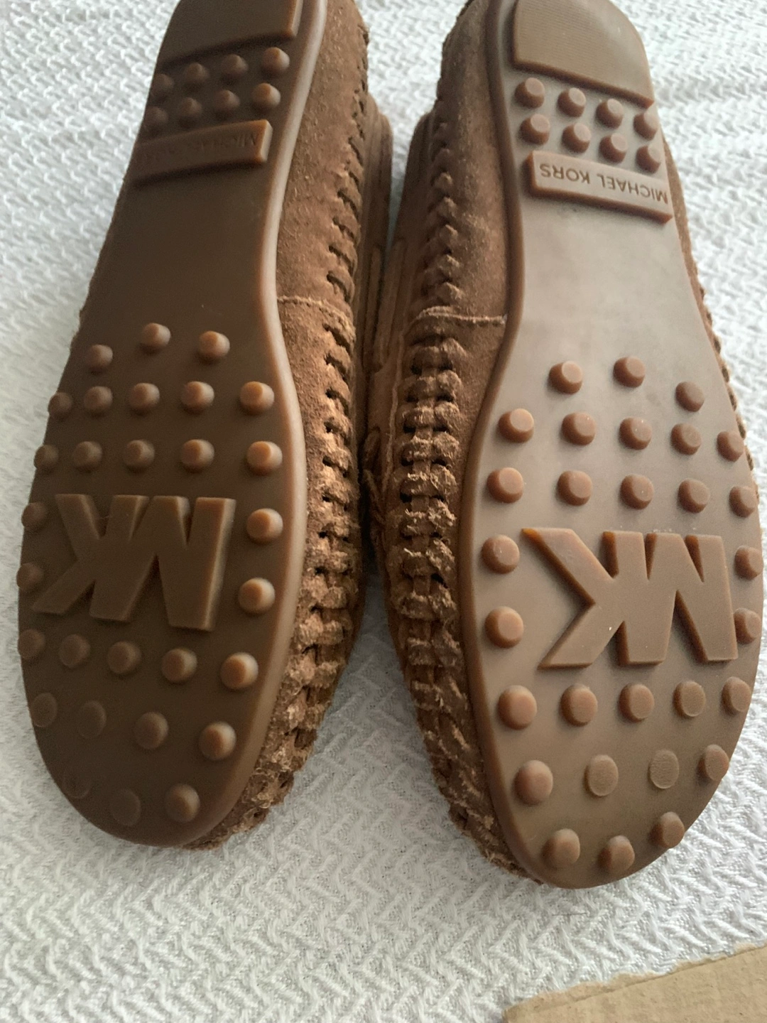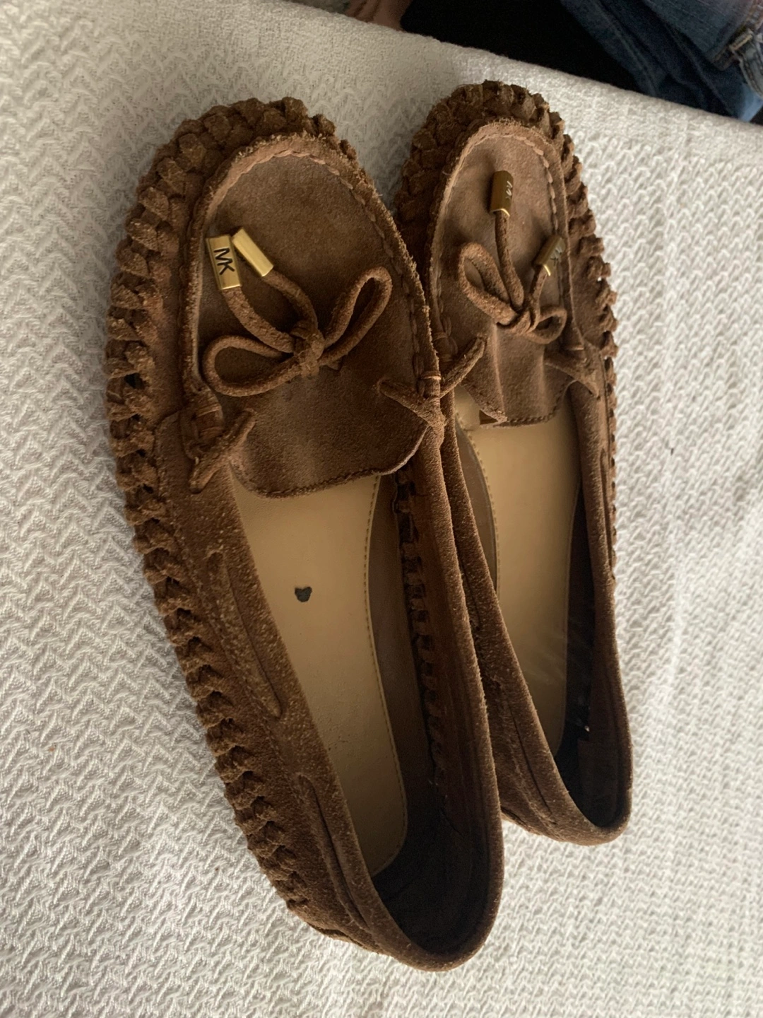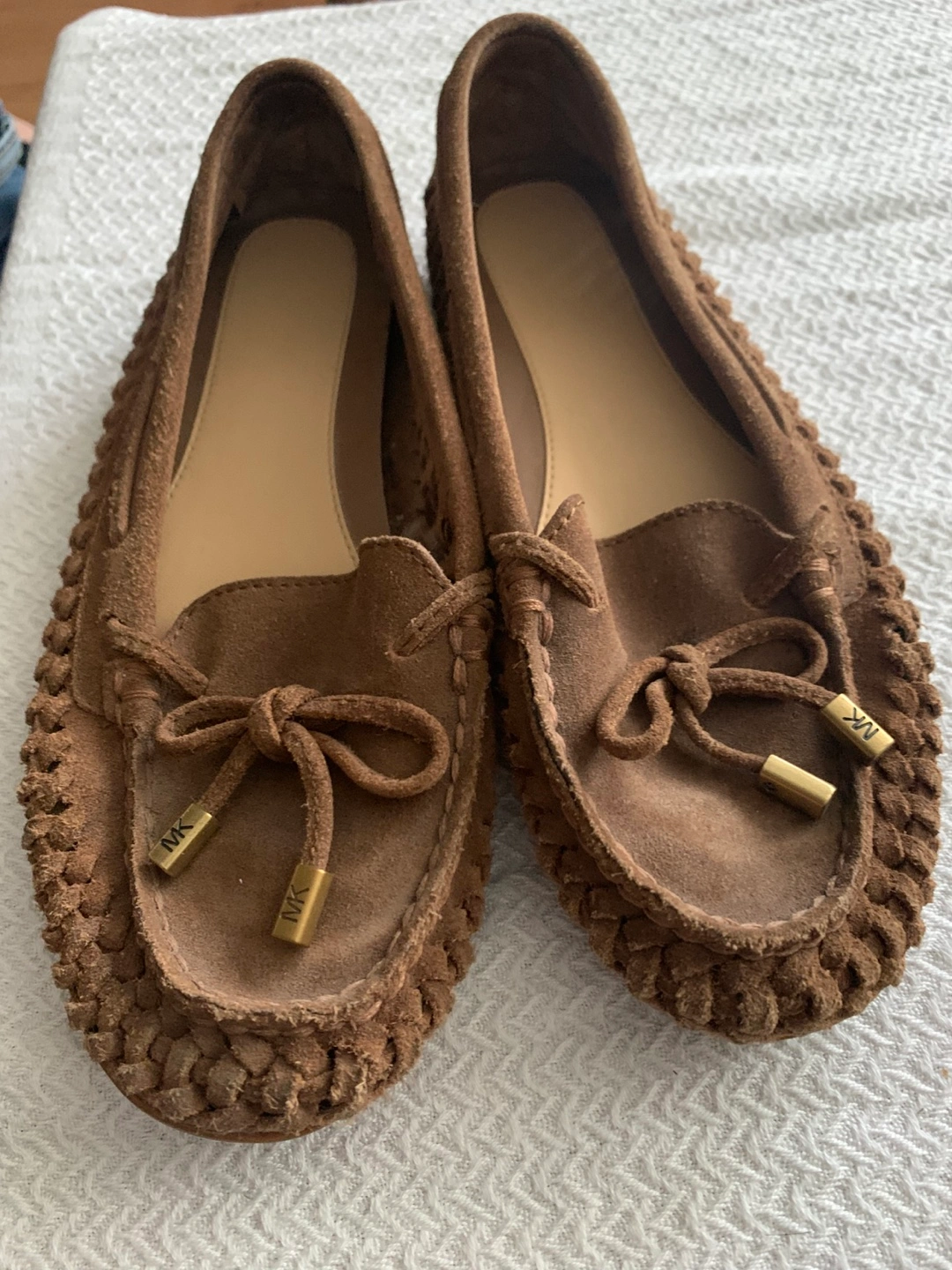 Brown suede loafers leather upper with a braided design. They have a bow on the top and a gold Michael Kors logo.