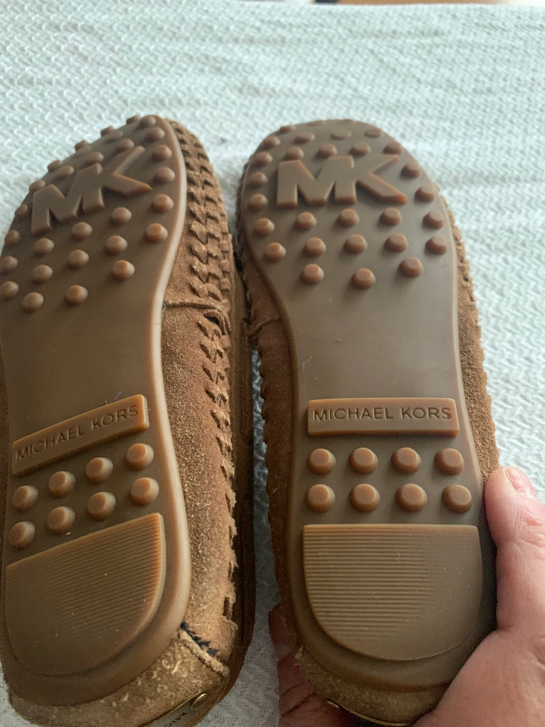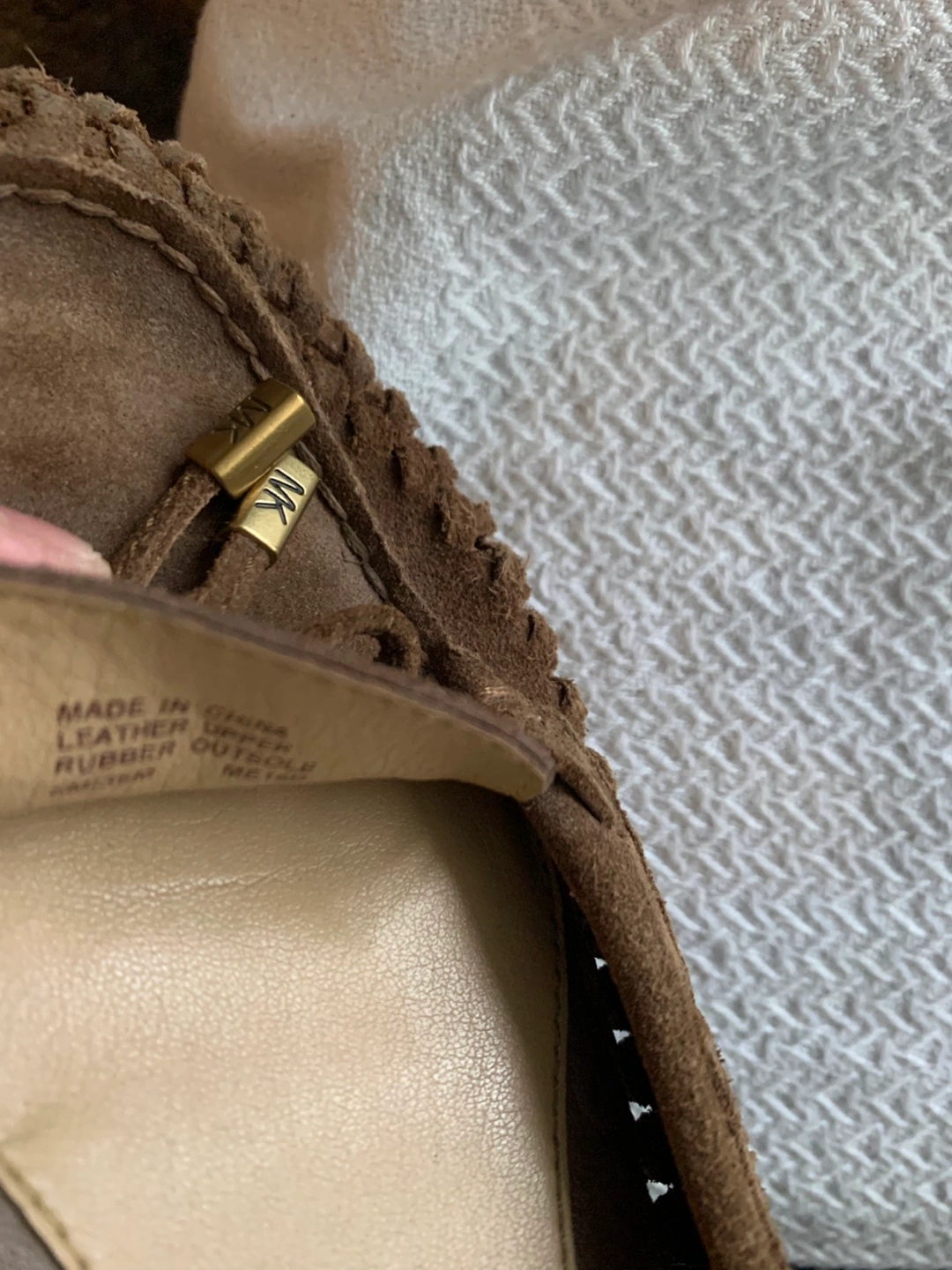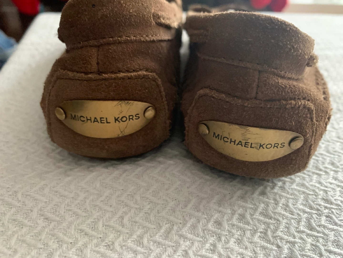 Brown suede loafers leather upper with a braided design. They have a bow on the top and a gold Michael Kors logo.