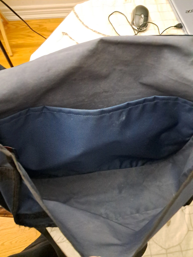 Blue messenger bag with non adjustable strap. One main compartment and one inside pocket.