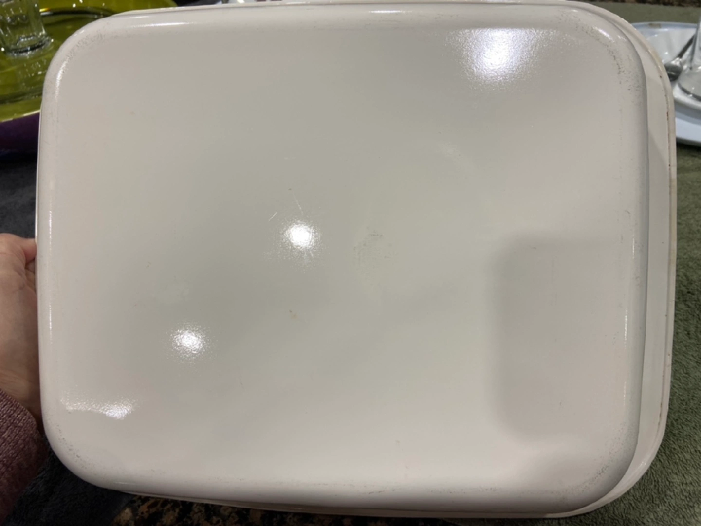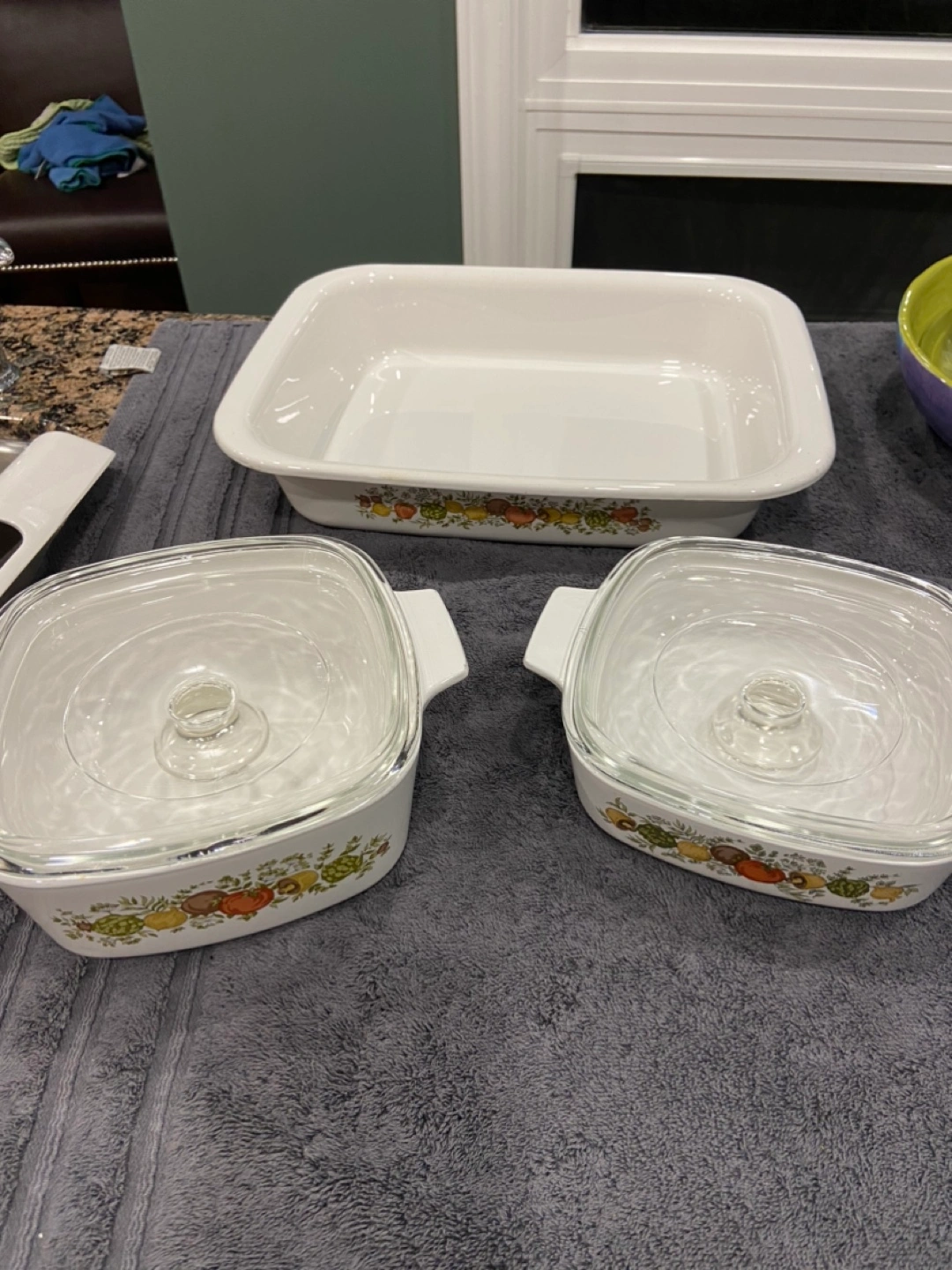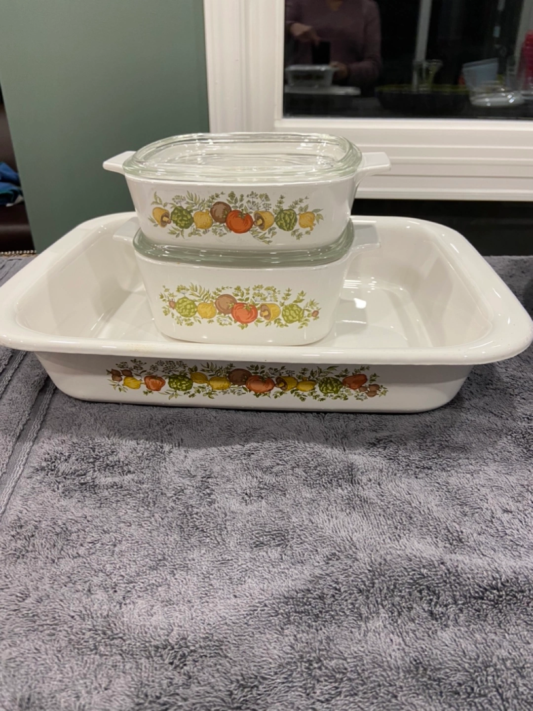 Vintage Pyrex casserole dish set, includes one large baking dish and two smaller casserole dishes with lids. All pieces have a vegetable design.