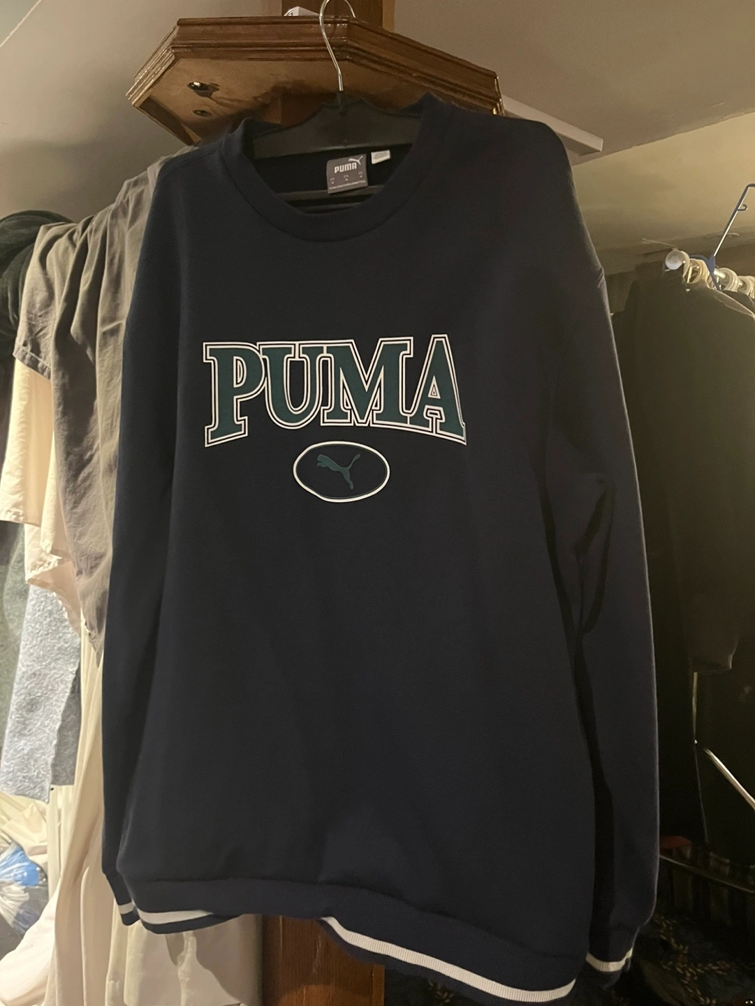 Navy blue sweatshirt with white trim. Large Puma logo on the front. Size M for men. It can fit women as large too. Brampton or Toronto Leslieville pick up
