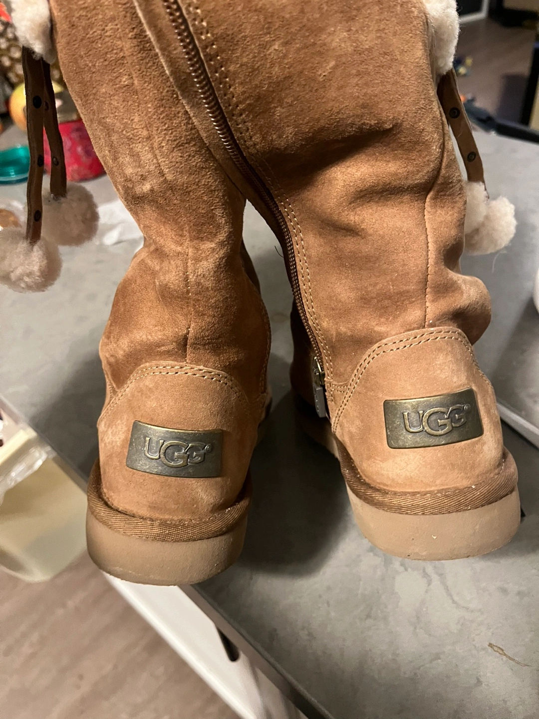 Brown suede boots with fur lining, zipper closure and pom poms. I stored it wrong in my cabinet and there was something else in the storage that rubbed off on the boots. It might come off. It might not.. It’s great for kids. They’re very small.